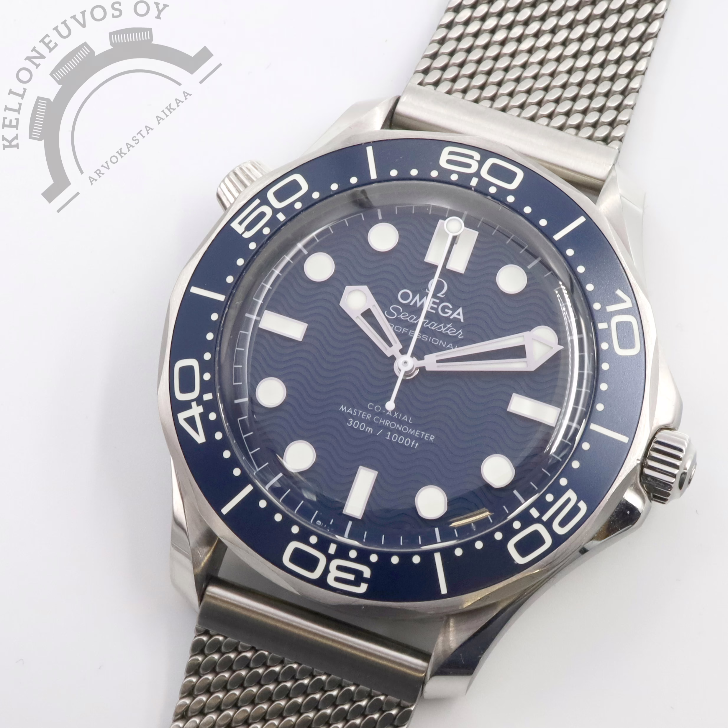 Tarjolle herkkua James Bond faneille. Siistissä kunnossa oleva, vuonna 2022 lanseerattu James Bondin 60-vuotis juhlamalli. Erittäin selkeälukuisella sinisellä oksaalihapolla anodisoidulla alumiinitaululla jossa klassiset laserkaiverretut aallot, upeat miekka osoittimet sekä tikkarimallinen sekuntiosoitin unohtamatta loistavaa lumetta. Teräksinen kuori sinisellä sukeltajankehällä jossa perinteikäs ylösalainen kolmio korvattu mallia kunnioittavalla ”60” merkinnällä. Kokonaisuuden kruunaa Omegan laadukas Mesh-ranneke. Kupera safiirilasi suojaa kellon etupuolta ja niinikään safiirisen takakannen alla tikkaa tarkasti Omegan 8806 -automaatti. Ostokuittia myöden täys setti, kellon takuukortti on päivätty 12/2023. Uuden ovh. 9600e.