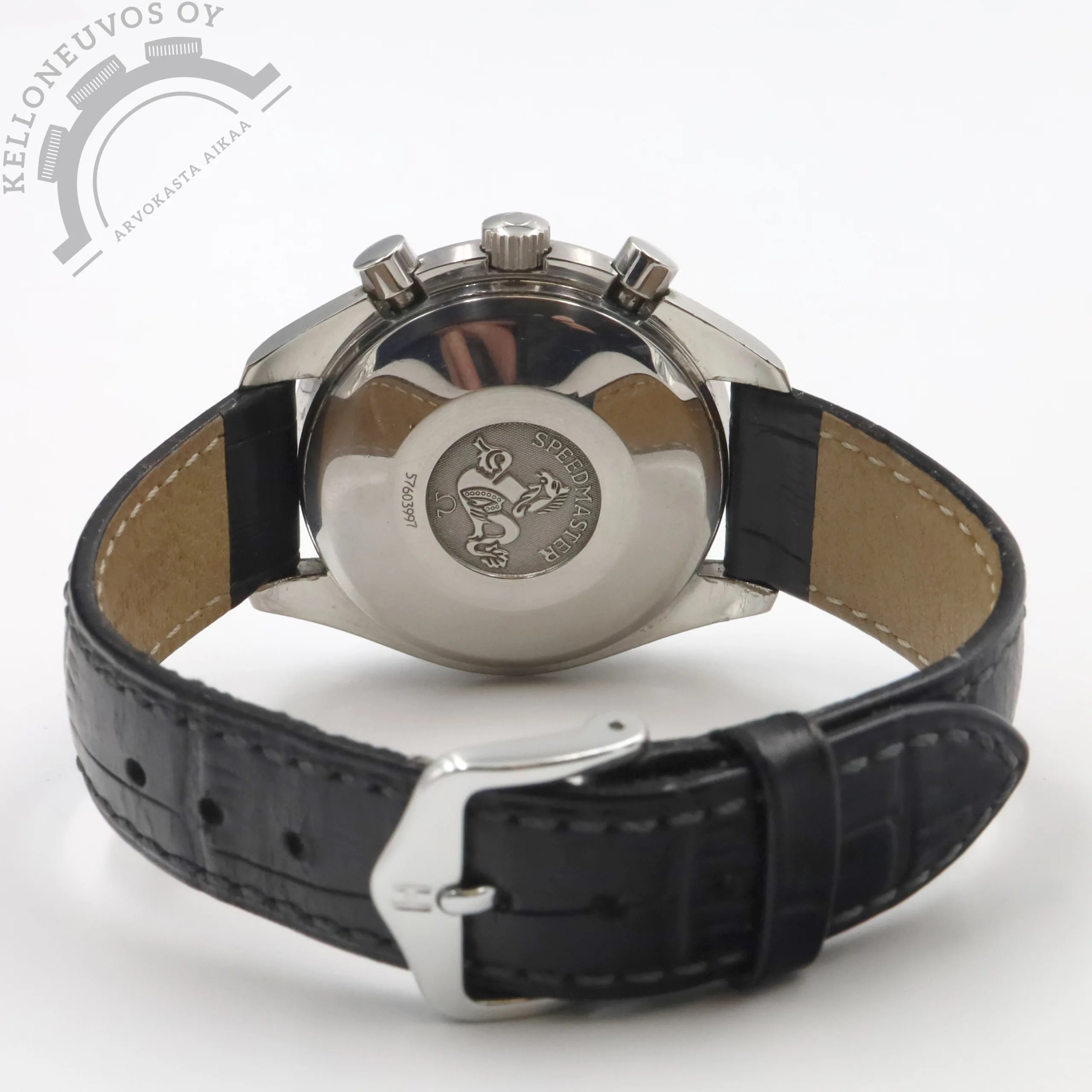 Tarjolle tyylikäs Speedmaster loistavalla määrällä komplikaatioita. Tyylikkäällä hopean värisellä sunburst taululla josta löytyy ajanotto, pikkusekunnit, päivä ja kuukausi näytöt, päivämäärä näyttö sekä 24h näyttö. Teräksinen kuori speedmasteriin kuuluvalla teräksisellä tachymetre-kehällä. Rannekkeena kelloon nätisti istuva musta Hirsch-nahkaranneke omalla soljella. Koneistona tikkaa tarkoin käyntiarvoin Omega 1151 -automaattikoneisto joka pohjautuu Valjoux 7751 -koneistoon. Kelloa seuraa molemmat laatikot, manuaalit, hang tag sekä alkuperäinen takuukortti. Kellon takuukortti on päivätty kotimaisen jälleenmyyjän toimesta 10/2002. Tästä erittäin sopivaan rahaan Speedmasteria uutta rannetta koristamaan.