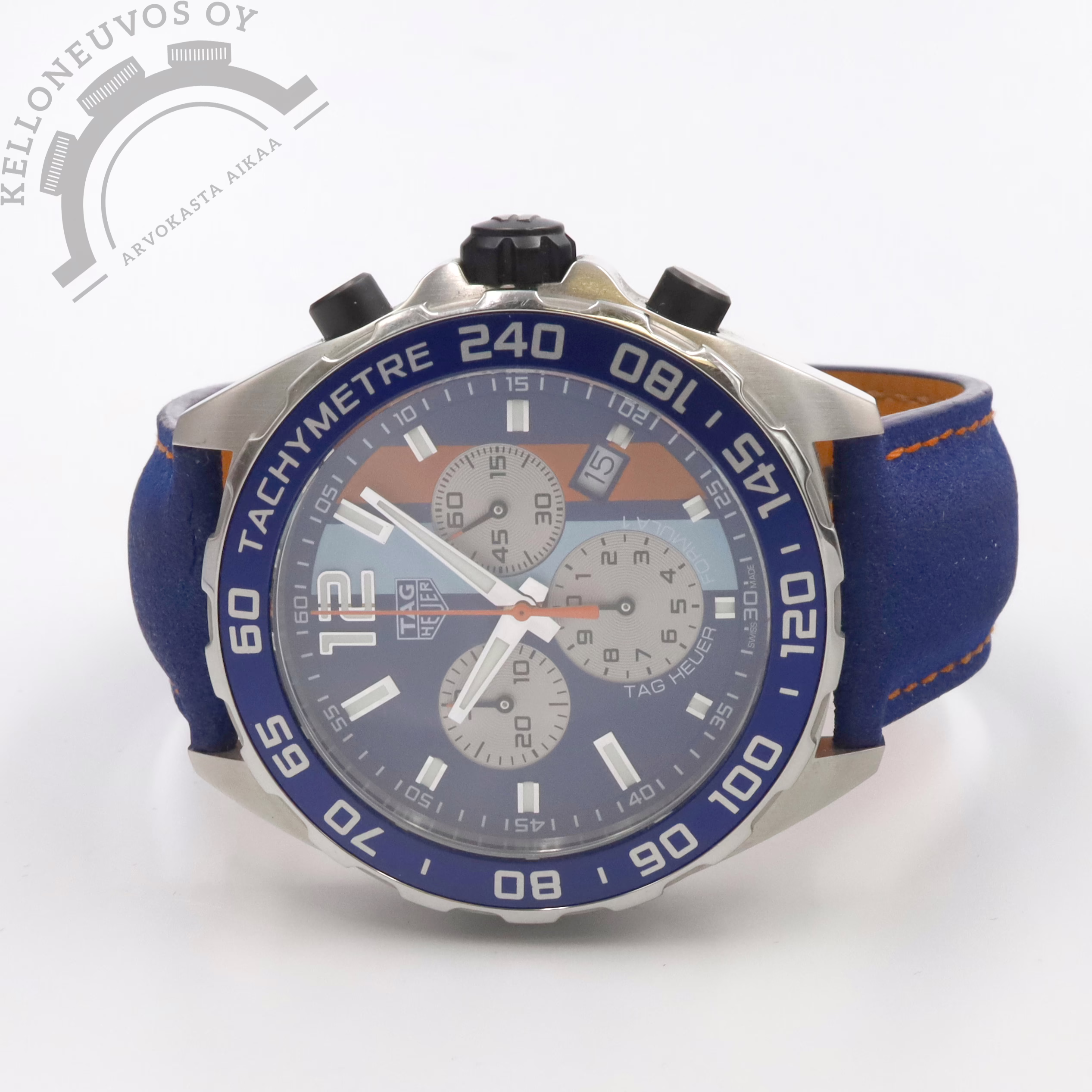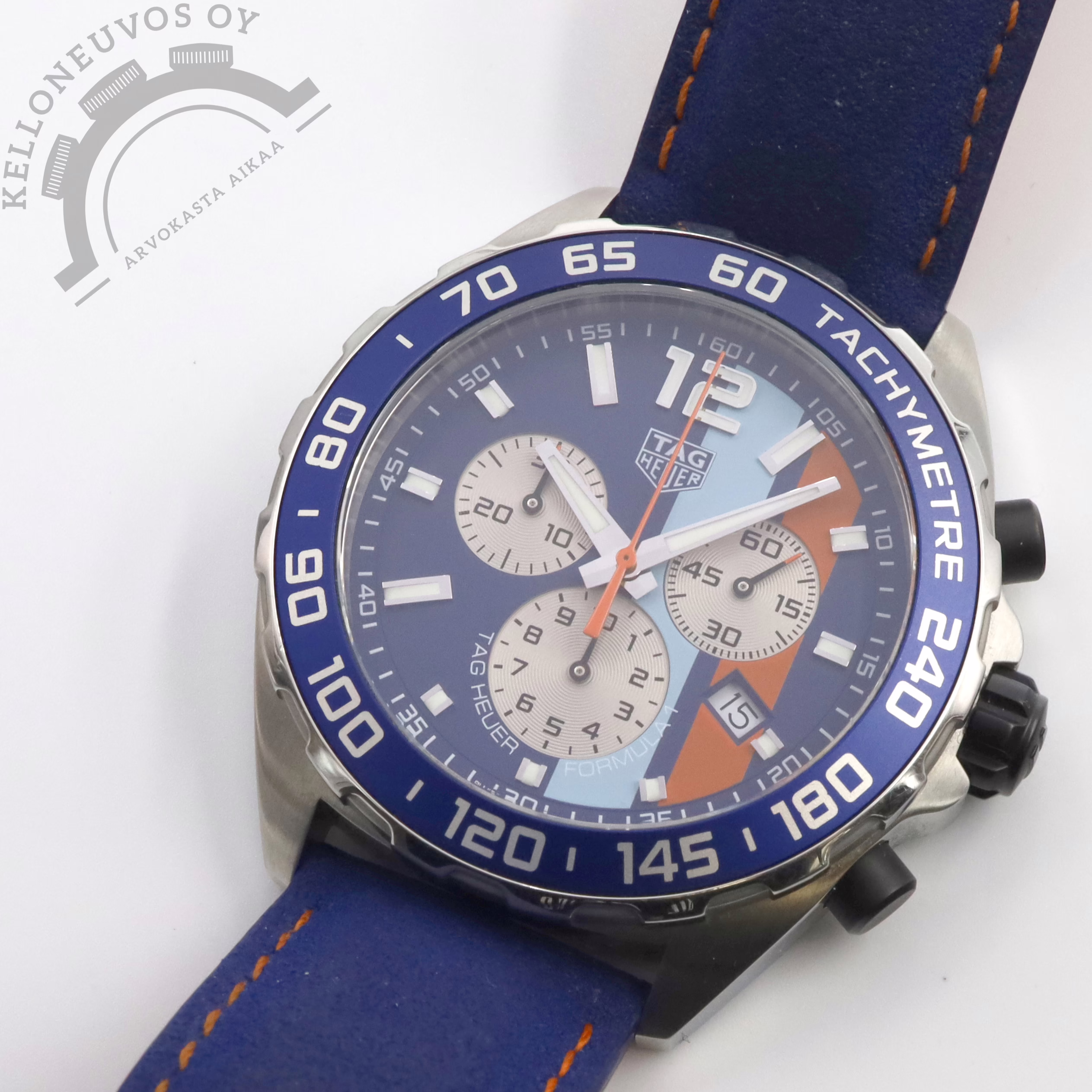 Tarjolle näyttävä TAG Heuer Formula 1 Gulf Edition. Upealla Gulf Oil Öljy-yhtiön väreissä olevalla taullulla jossa päivyri, ajanotto sekä pikkusekunnit. Teräksinen kuori sinisellä Tachymetre kehällä varusteltuna. Kokonaisuuden kruunaa sininen alcantara-ranneke oransseilla tikkauksilla ja omalla soljella. Koneistona huoleton ja tarkkakäyntinen kvartsi. Täys setti alkuperäistä ostokuittia myöden. Kellon takuukortti on päivätty kotimaisen jälleenmyyjän toimesta 11/2023.
