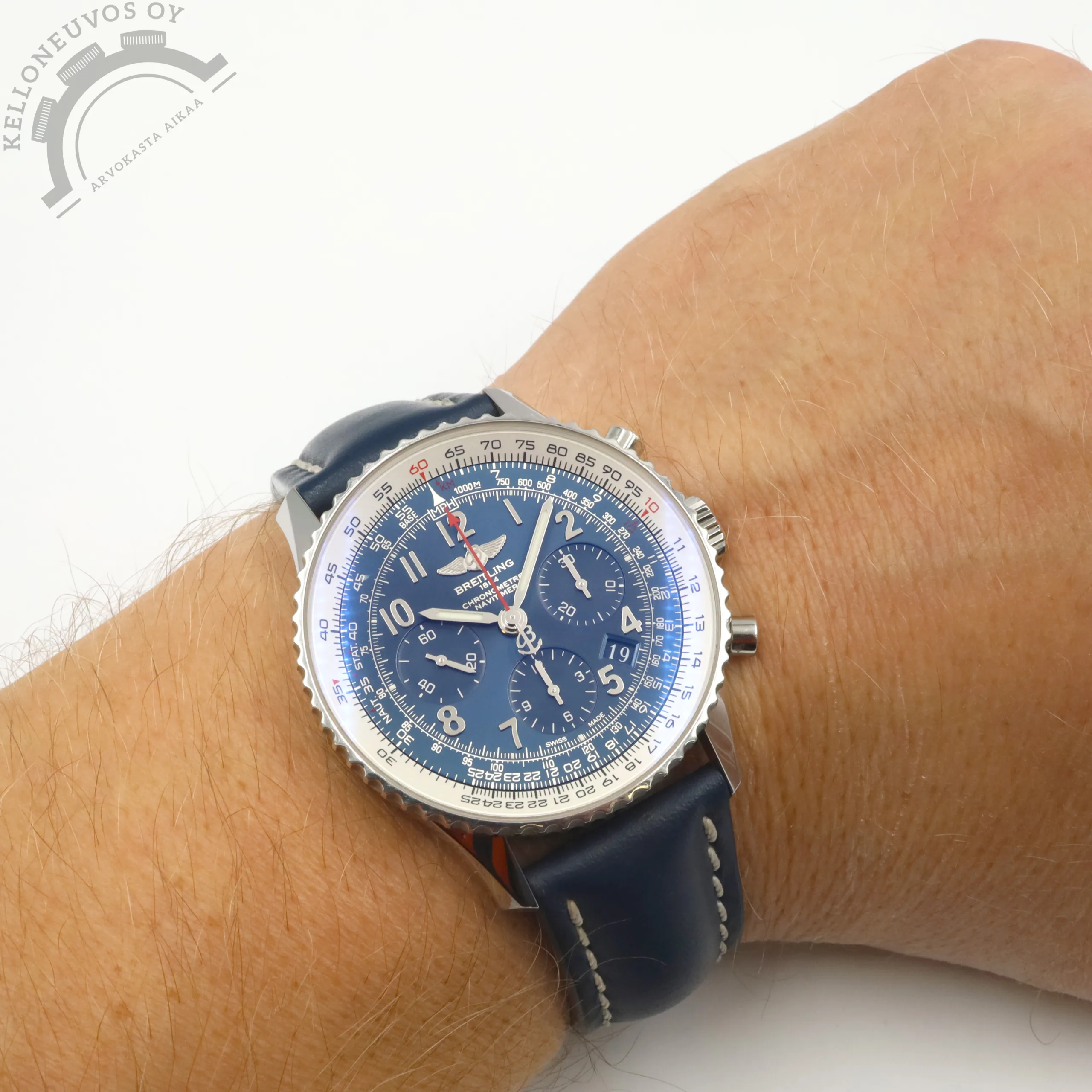 Tarjolle tajuttoman upea sekä harvemmin tarjolla oleva sinisellä taululla varustettu Limited Edition Navitimer. Kelloa valmistettu ainoastaan rajattu 1000kpl erä. Näyttävällä sinisellä taululla josta löytyy ajanotto, päivyri sekä pikkusekunnit. Kiillotettu teräksinen kuori yhdistettynä laadukkaaseen siniseen nahkarannekkeeseen omalla soljella kruunaa kokonaisuuden. Safiirilasit molemmin puolin runkoa, takakannen läpi pääset ihastelemaan Breitling B01 -automaattikoneistoa jossa 70h käyntivara. Full set, kellon elektroninen takuukortti on aktivoitu 2/2020.