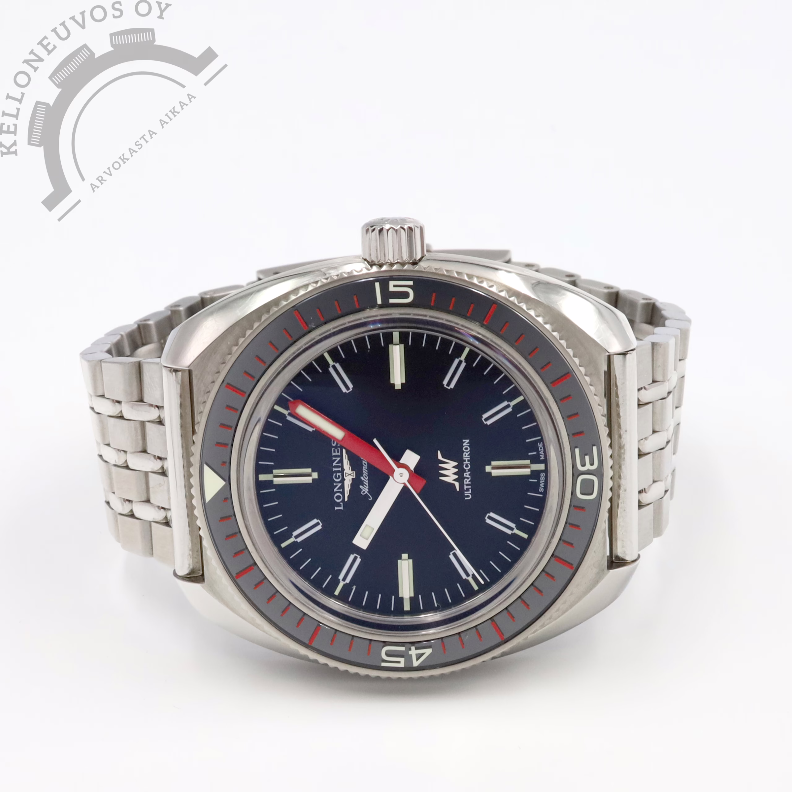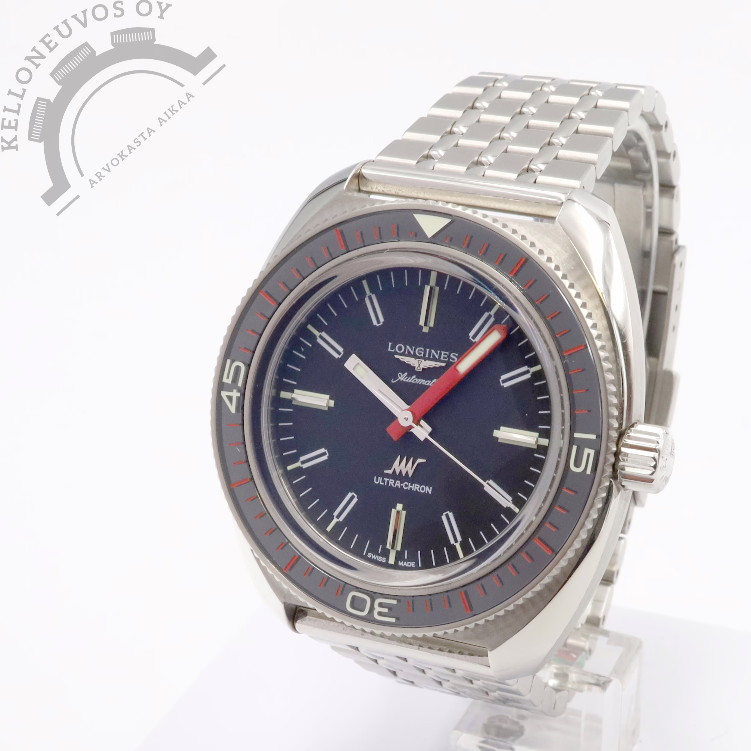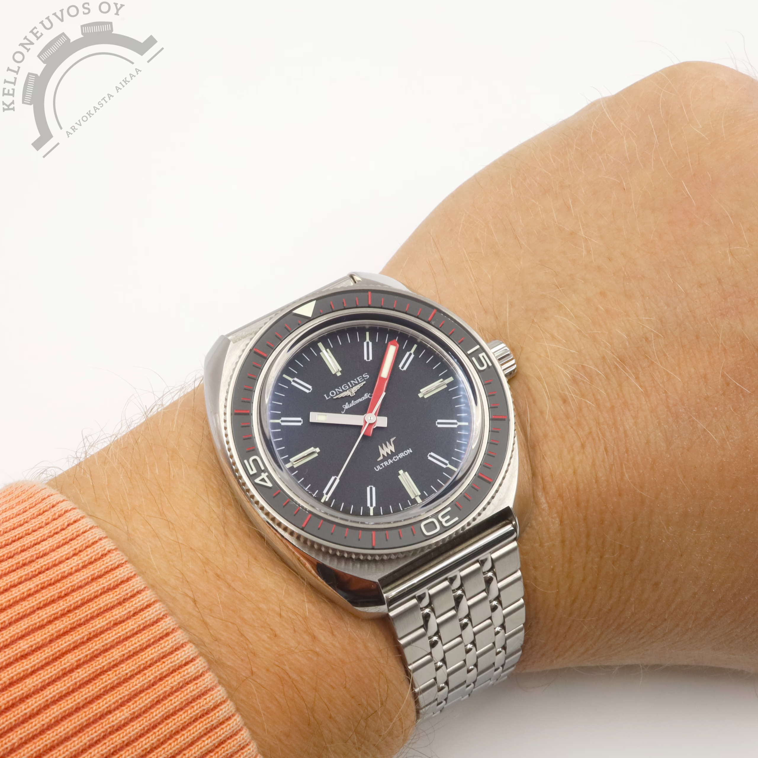 Tarjolle tuorein paperein varustettu, näyttävä uusintapainos Longineksen vuoden 1968 Ultra-Chron Diverista. Tyylikkäällä ja selkeäluisella mattamustalla taululla jossa vahvasti superluminoivat indeksit sekä näyttävyyttä lisäävä punainen minuuttiosoitin. Cushion muotoiltu kiillotettu teräksinen kuori sekä keraaminen kehä jossa super-luminoivat numeroinnit. Kokonaisuuden kruunaa erittäin mukavan ranneistuvuuden omaava seitsemän rivinen teräsranneke. Kupera safiirilasi suojaa kellon etupuolta kun taas teräksisen takakannen alla tikkaa korkeataajuuksinen Longines L836.6- automaattikoneisto. Full set, kellon takuukortti on päivätty kotimaisen jälleenmyyjän toimesta 8/2025. Kellon suositushinta uutena 4500e.