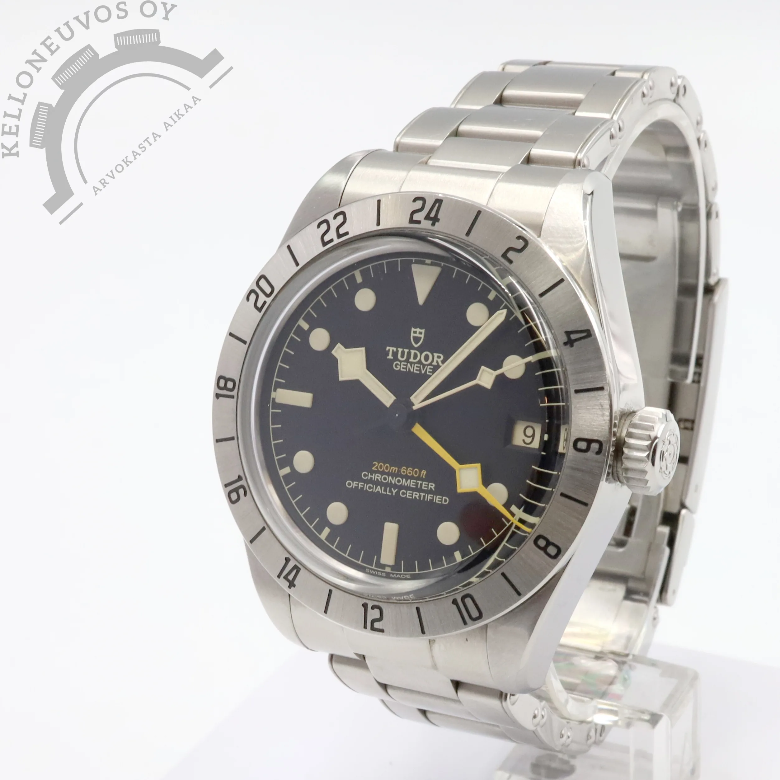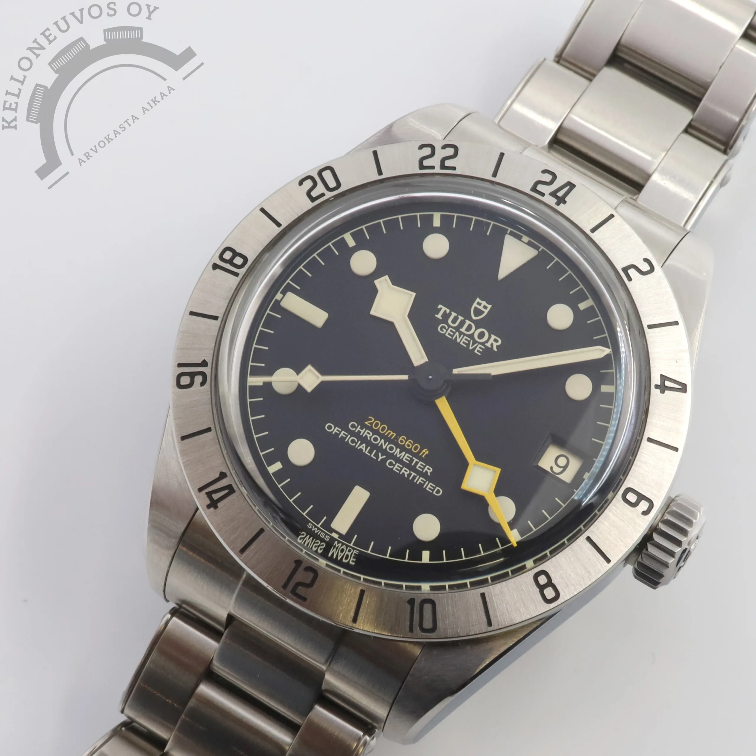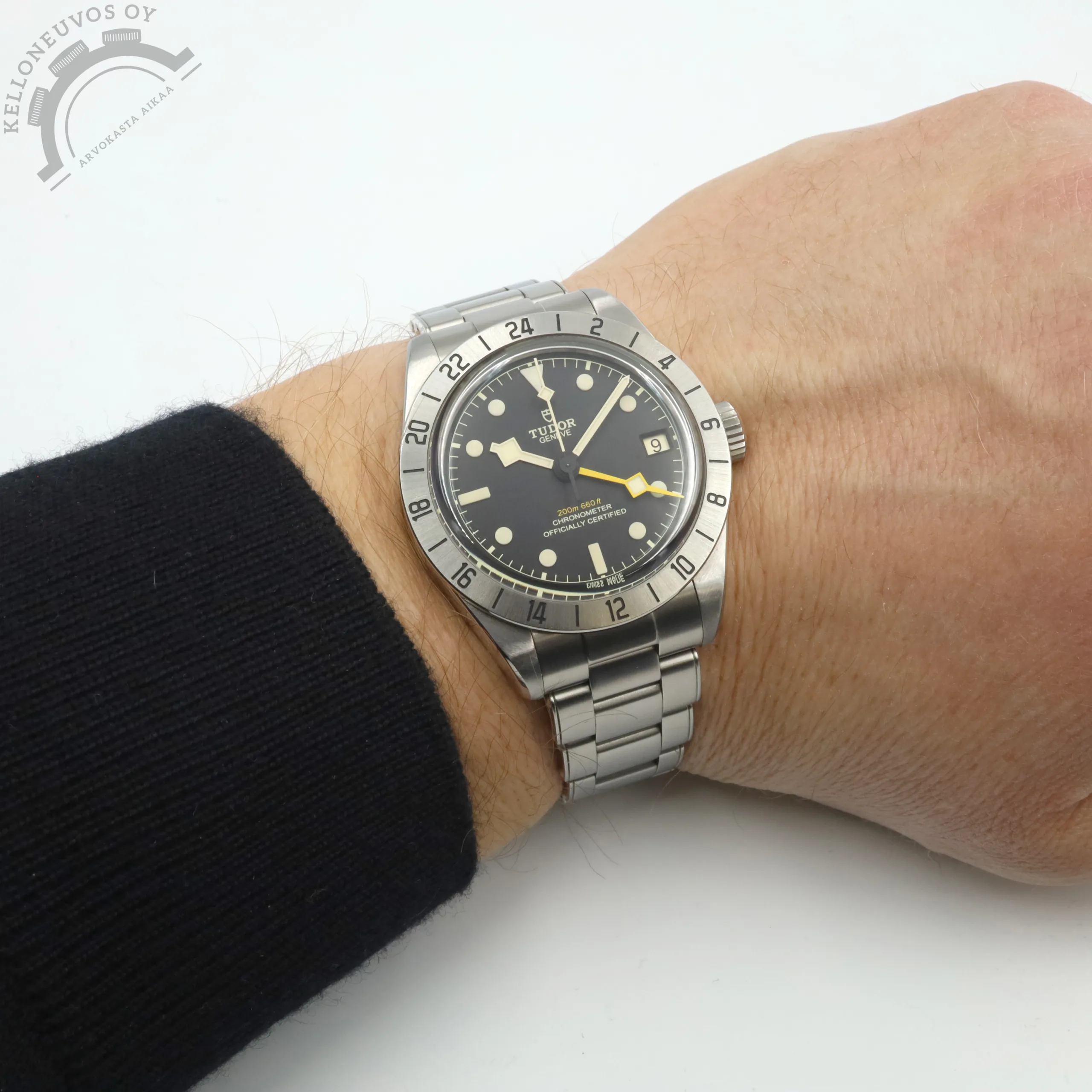 Tarjolle siistissä kunnossa oleva Tudor BB Pro. Selkeälukuisella mustalla taululla jossa päivyri sekä näyttävyyttä lisäävä keltainen GMT -kaksoisaika osoitin. Kiillotettu teräksinen kuori teräksisellä kehällä jossa 24h numeroinnit. Kokonaisuuden kruunaa laadukas teräsranneke jossa käyttömukavuutta lisäävä Tudorin T-fit claspi. Koneistona toimii tarkoin käyntiarvoin tikkaava Tudor MT5652 -automaattikoneisto jossa 70h käyntivara. Full set, kellon takuukortti on päivätty 11/2022.