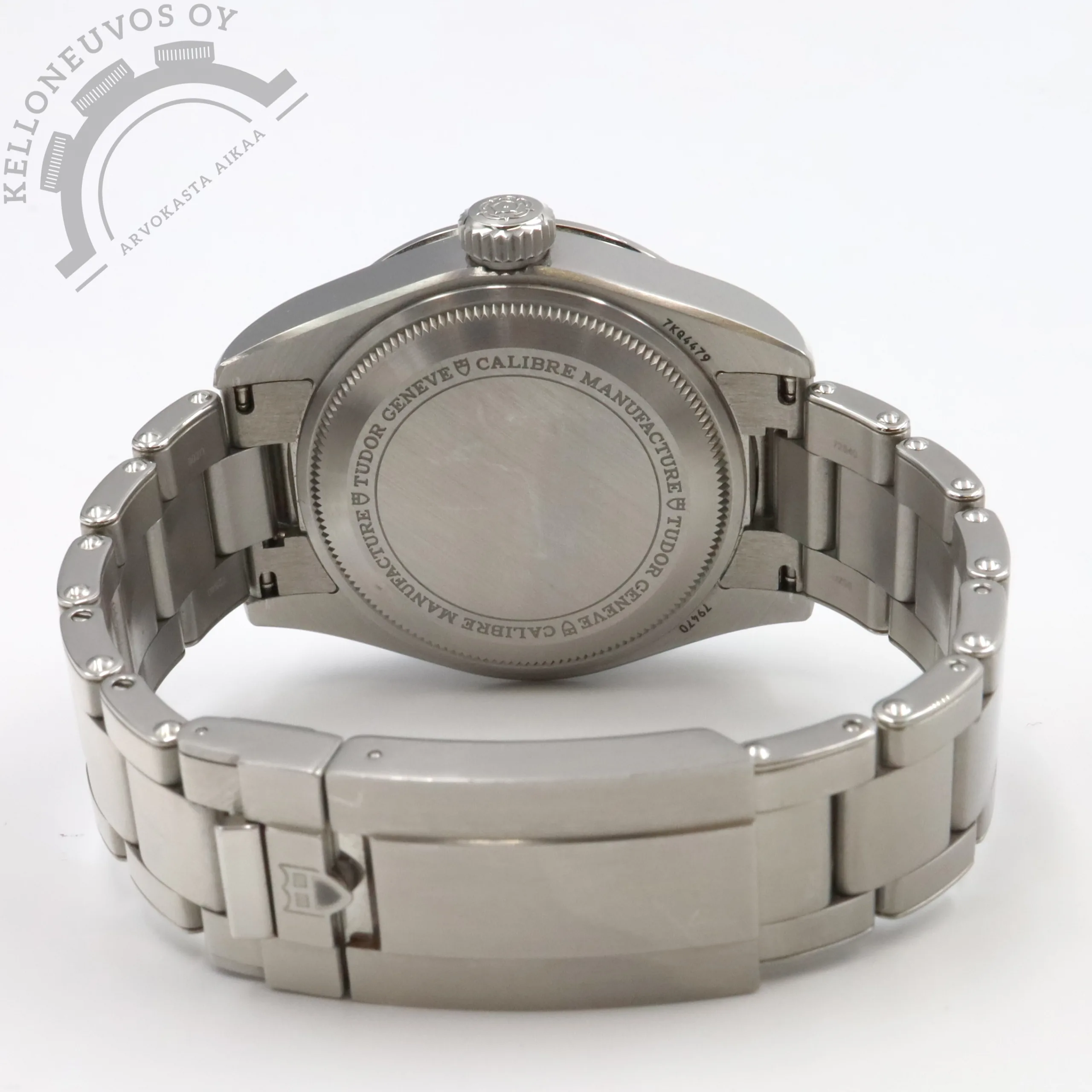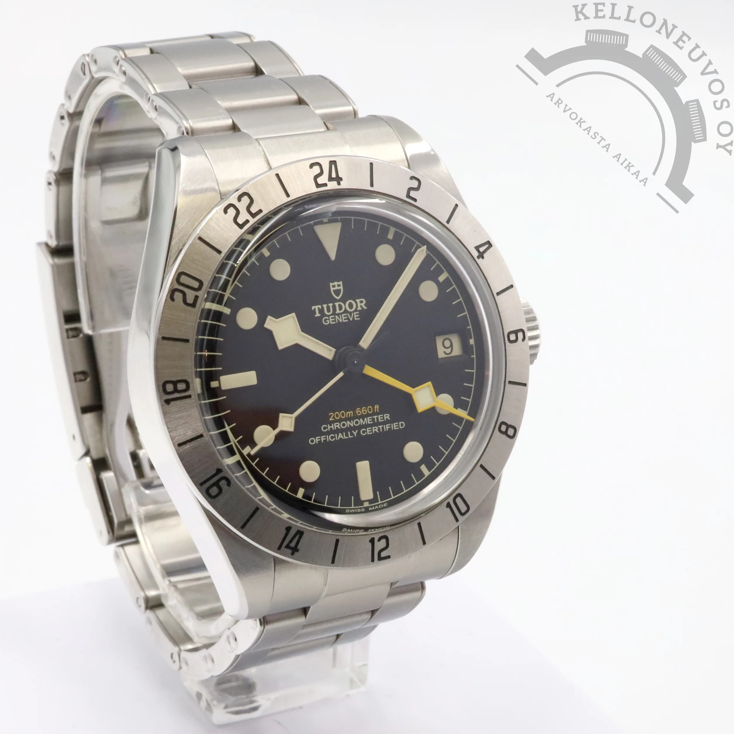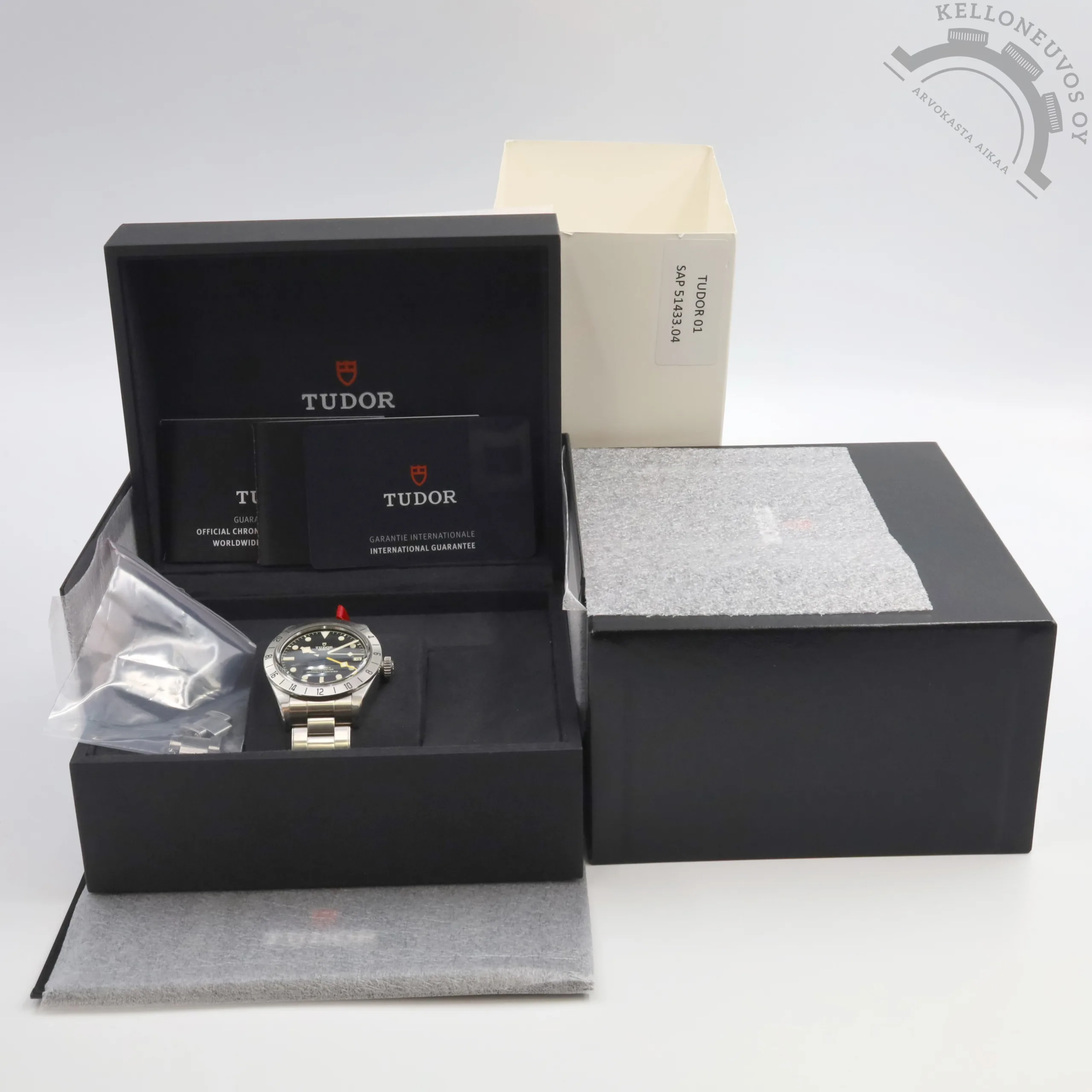 Tarjolle siistissä kunnossa oleva Tudor BB Pro. Selkeälukuisella mustalla taululla jossa päivyri sekä näyttävyyttä lisäävä keltainen GMT -kaksoisaika osoitin. Kiillotettu teräksinen kuori teräksisellä kehällä jossa 24h numeroinnit. Kokonaisuuden kruunaa laadukas teräsranneke jossa käyttömukavuutta lisäävä Tudorin T-fit claspi. Koneistona toimii tarkoin käyntiarvoin tikkaava Tudor MT5652 -automaattikoneisto jossa 70h käyntivara. Full set, kellon takuukortti on päivätty 11/2022.