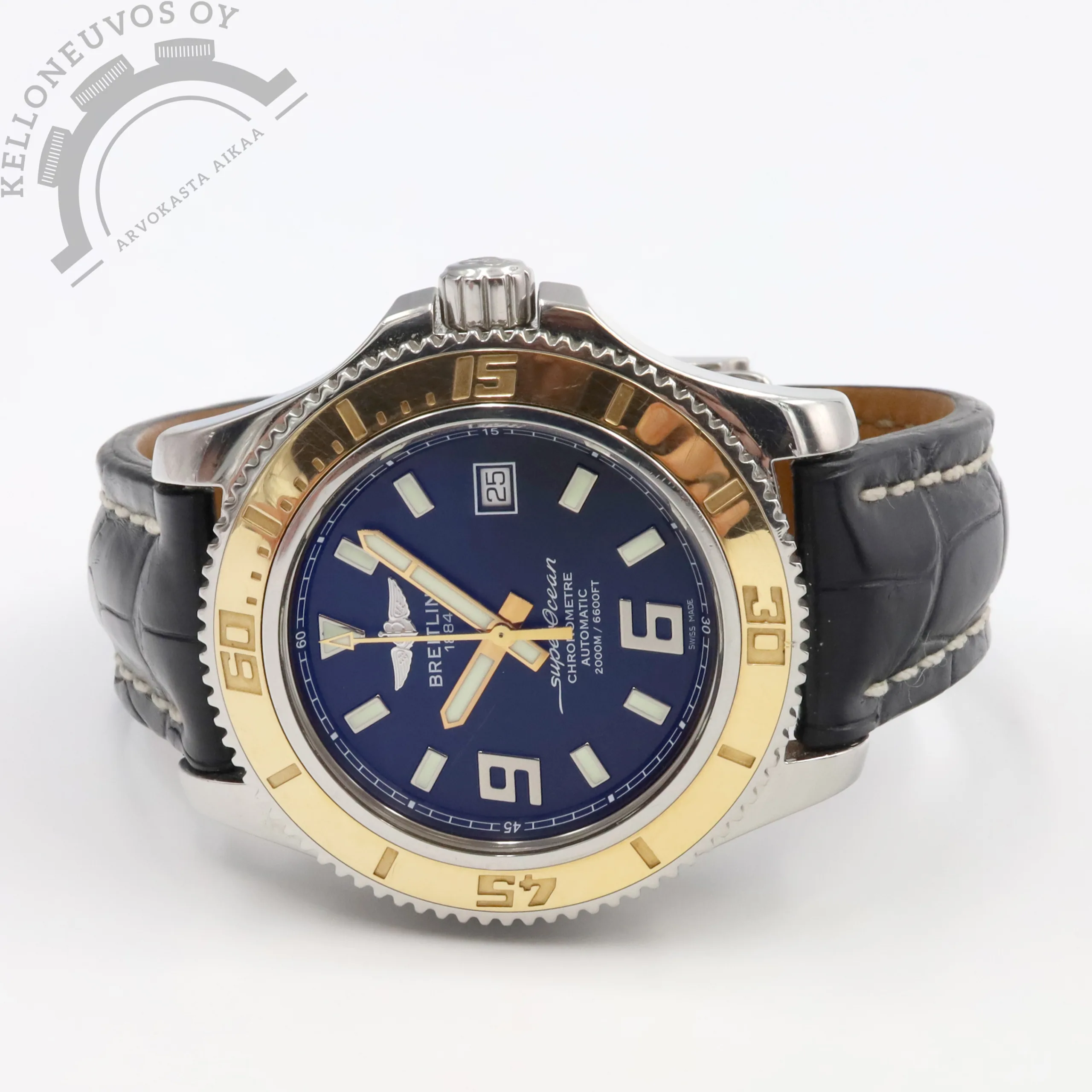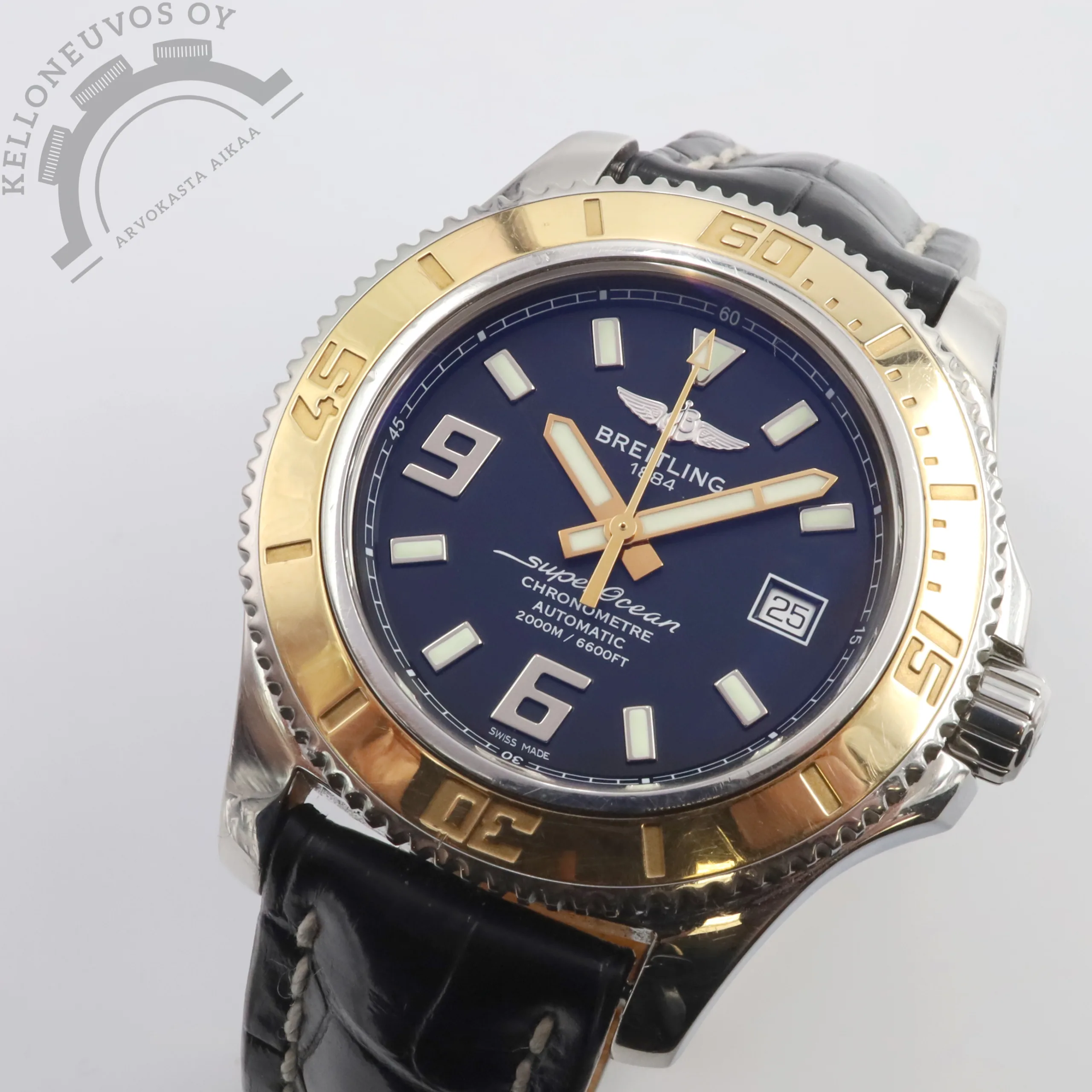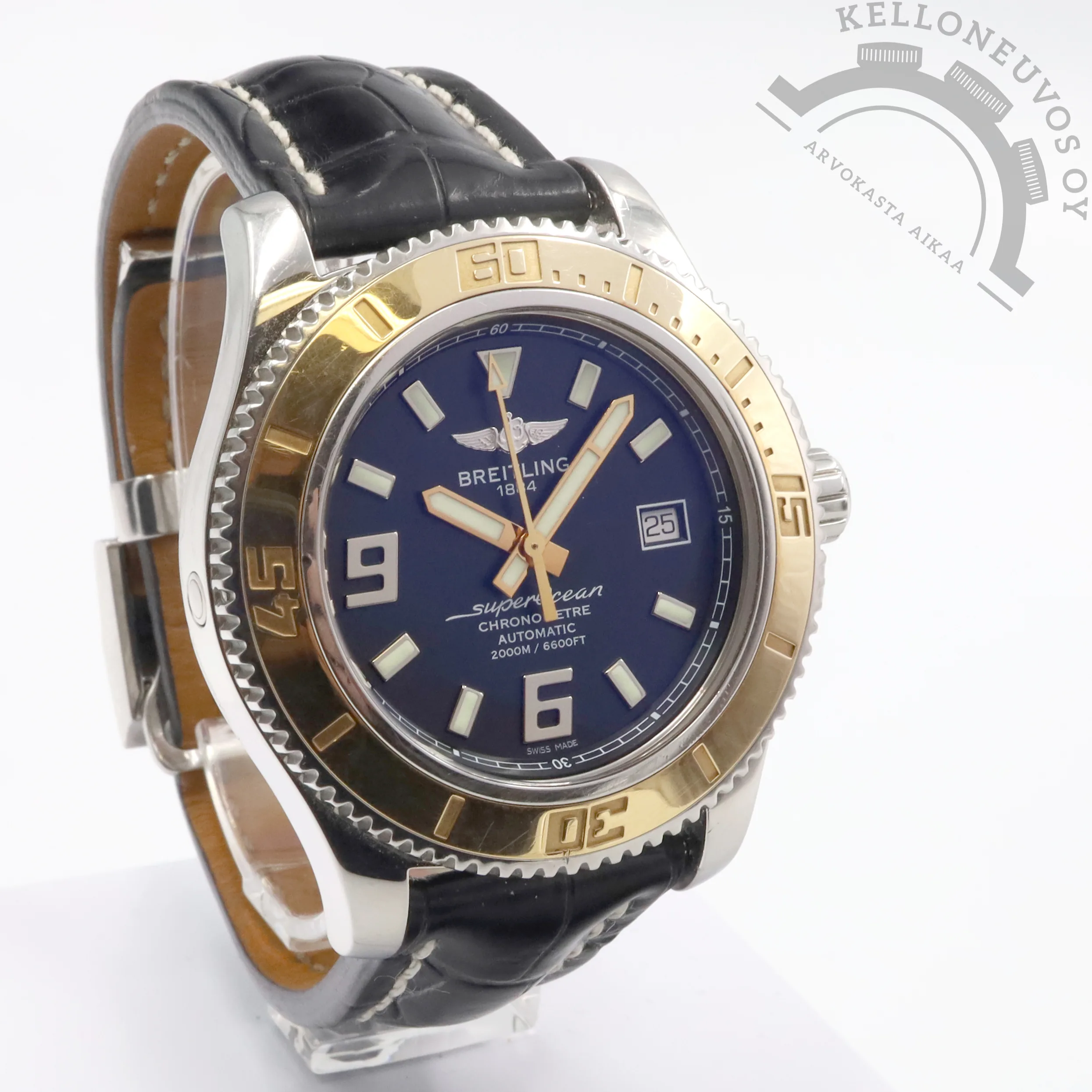 Tarjolle ikäisekseen siistissä kunnossa oleva, näyttävä Breitling Superocean. Selkeälukuisella mustalla taululla jossa päivyri sekä vahvan lumen omaavat osoittimet ja indeksit. Kiillotettu teräksinen kuori sekä näyttävyyttä lisäävä 18K ruusukultaa oleva kehä. Rannekkeena Breitlingin laadukas musta nahkaranneke omalla soljella. Koneistona toimii tarkoin käyntiarvoin tikkaava Breitling 17 -automaattikoneisto joka perustuu ETA 2824-2 -koneistoon. Kelloa seuraa molemmat laatikot, kaikki alkuperäiset paperit, tuoreet käyntitestitulokset sekä elektroninen takuukortti. Kellon elektroninen takuukortti on aktivoitu kotimaisen jälleenmyyjän toimesta 8/2013. Ei dokumentoitua huoltohistoriaa.