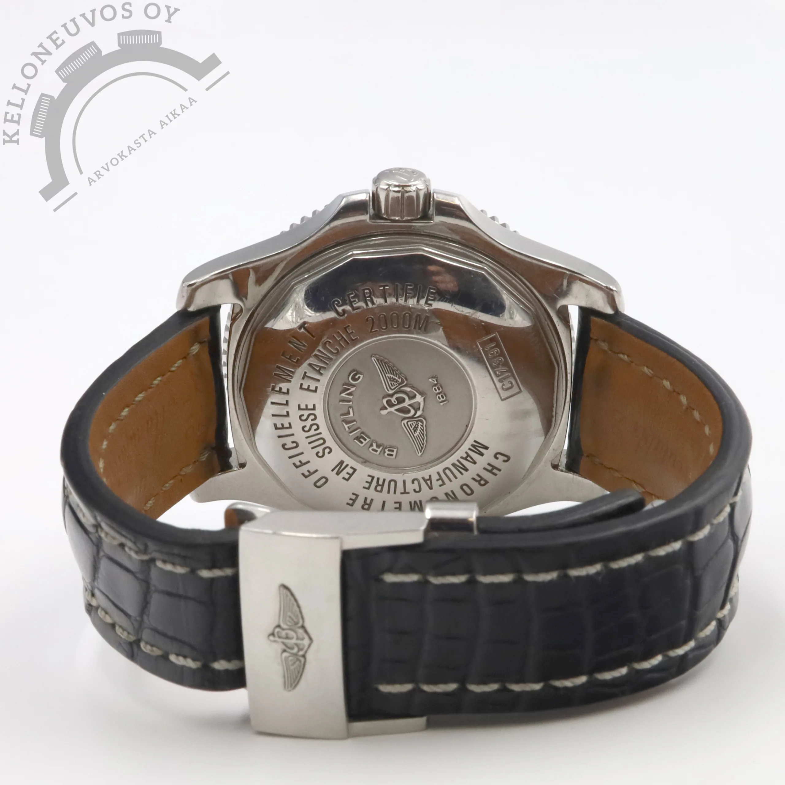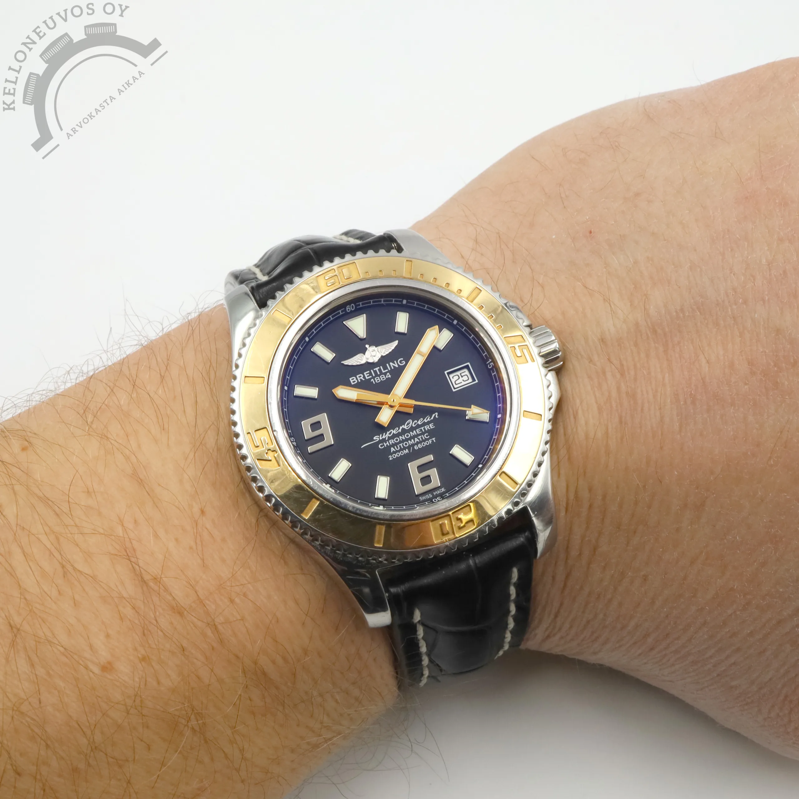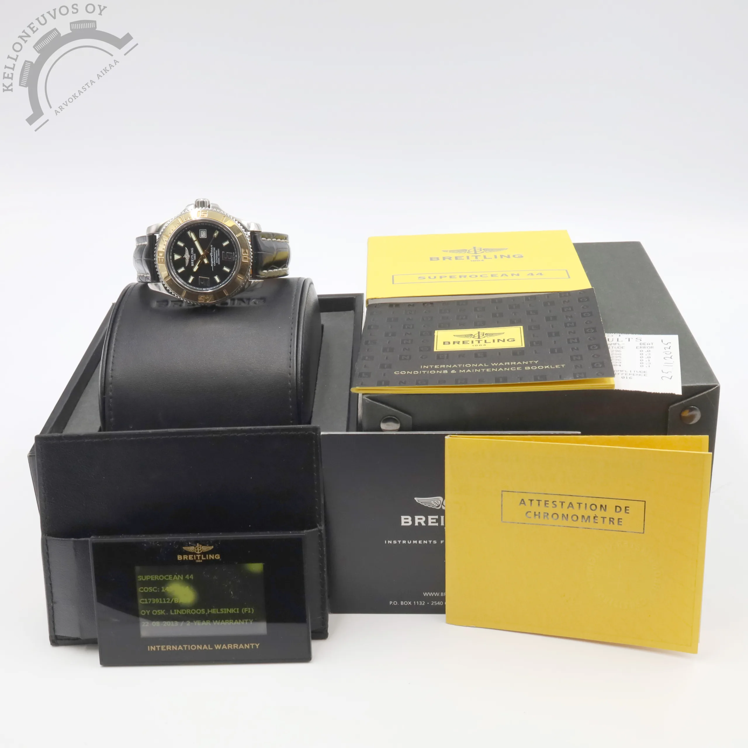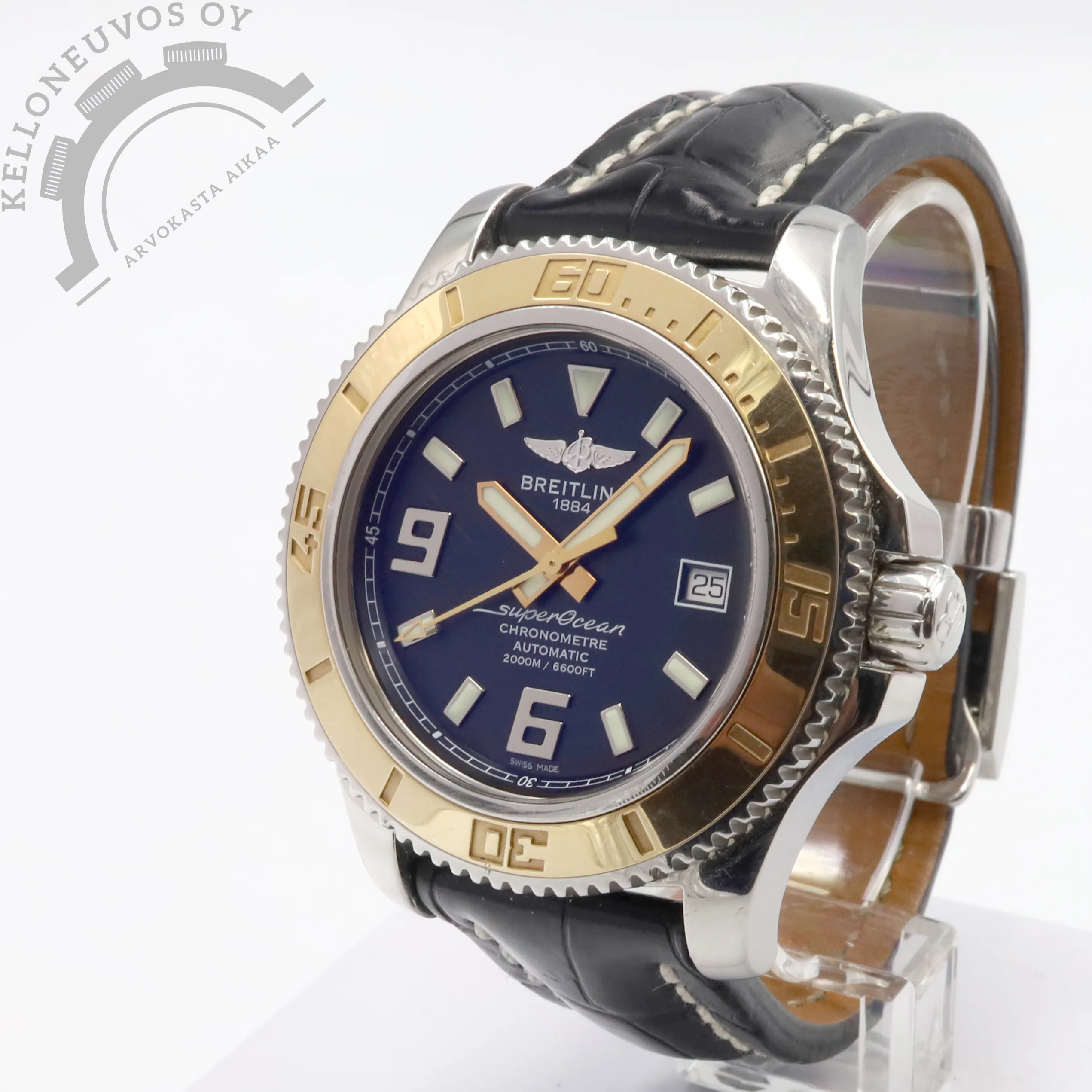 Tarjolle ikäisekseen siistissä kunnossa oleva, näyttävä Breitling Superocean. Selkeälukuisella mustalla taululla jossa päivyri sekä vahvan lumen omaavat osoittimet ja indeksit. Kiillotettu teräksinen kuori sekä näyttävyyttä lisäävä 18K ruusukultaa oleva kehä. Rannekkeena Breitlingin laadukas musta nahkaranneke omalla soljella. Koneistona toimii tarkoin käyntiarvoin tikkaava Breitling 17 -automaattikoneisto joka perustuu ETA 2824-2 -koneistoon. Kelloa seuraa molemmat laatikot, kaikki alkuperäiset paperit, tuoreet käyntitestitulokset sekä elektroninen takuukortti. Kellon elektroninen takuukortti on aktivoitu kotimaisen jälleenmyyjän toimesta 8/2013. Ei dokumentoitua huoltohistoriaa.