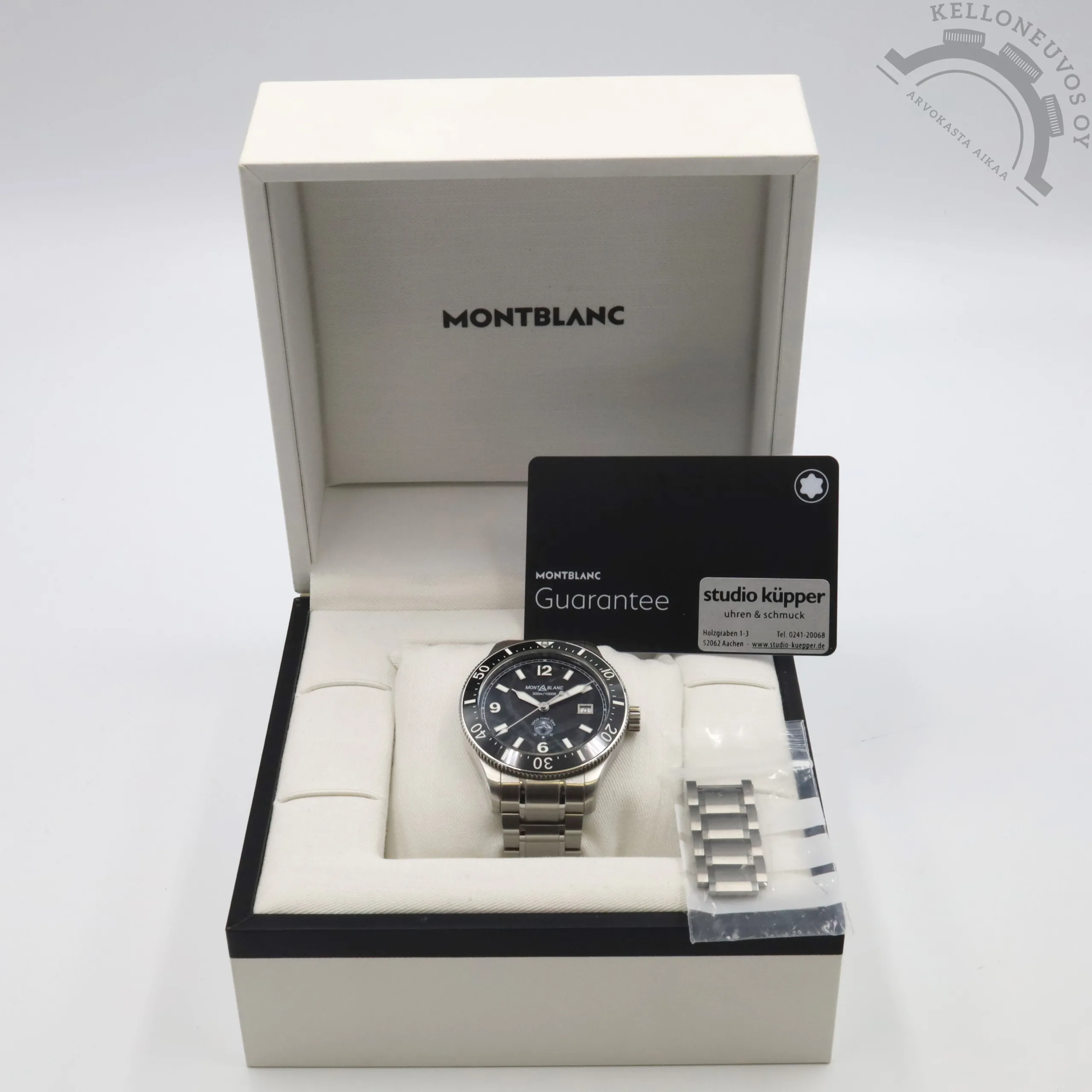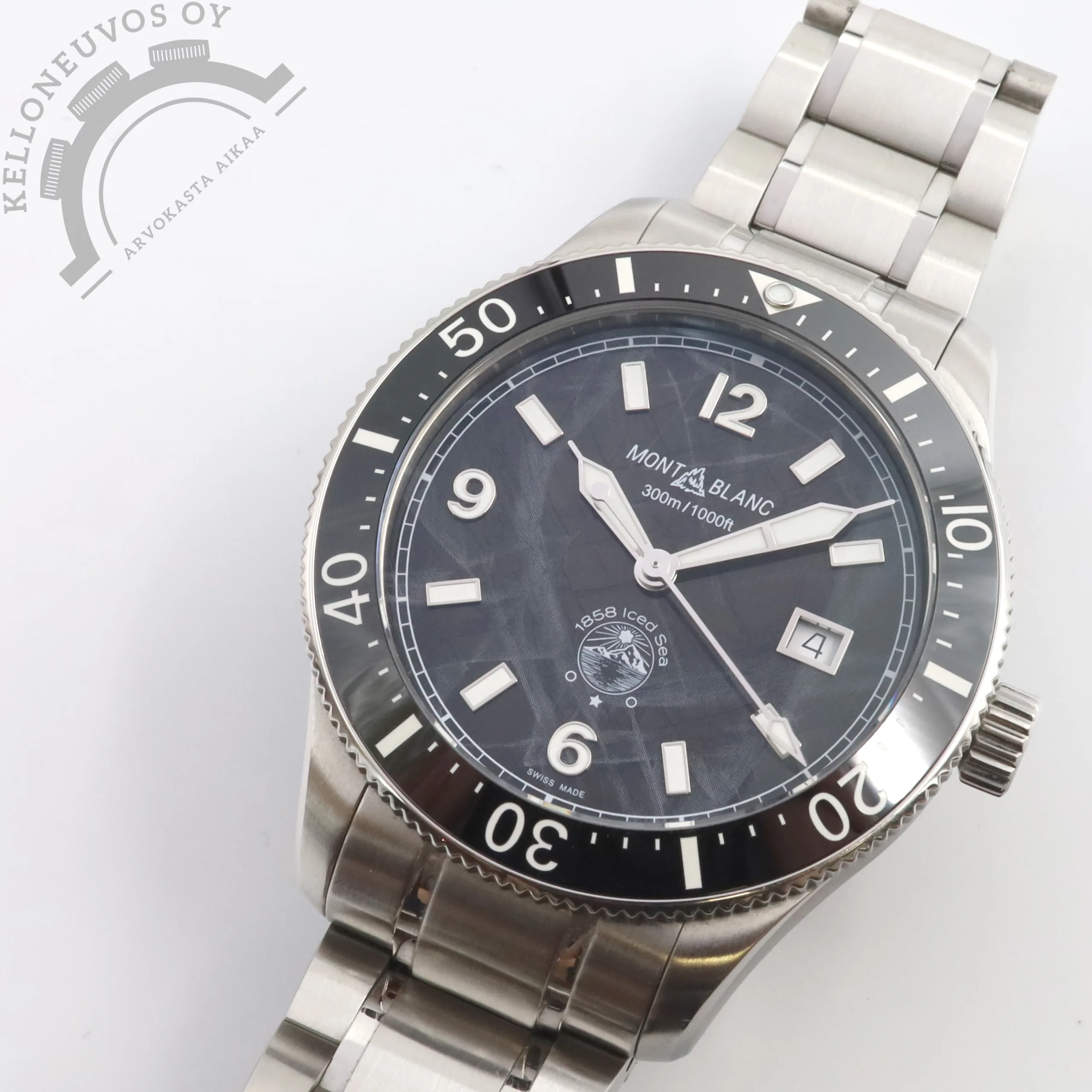 Tarjolle todella tyylikäs Montblanc Iced Sea Diver. Erittäin upealla mustan harmaalla taululla jossa ihailtavaa riittää. Teräksinen kuori mustalla keraamisella kehällä sekä laadukkaalla teräsrannekkeella jossa käyttömukavuutta lisäävä micro säädettävä claspi. Koneistona toimii MB 24.17- automaattikaliiperi joka pohjautuu Sellitan SW200-1 koneistoon. Kelloa seuraa laatikko, jatkopalat sekä takuukortti. Kellon takuukortti on päivätty 7/2023.