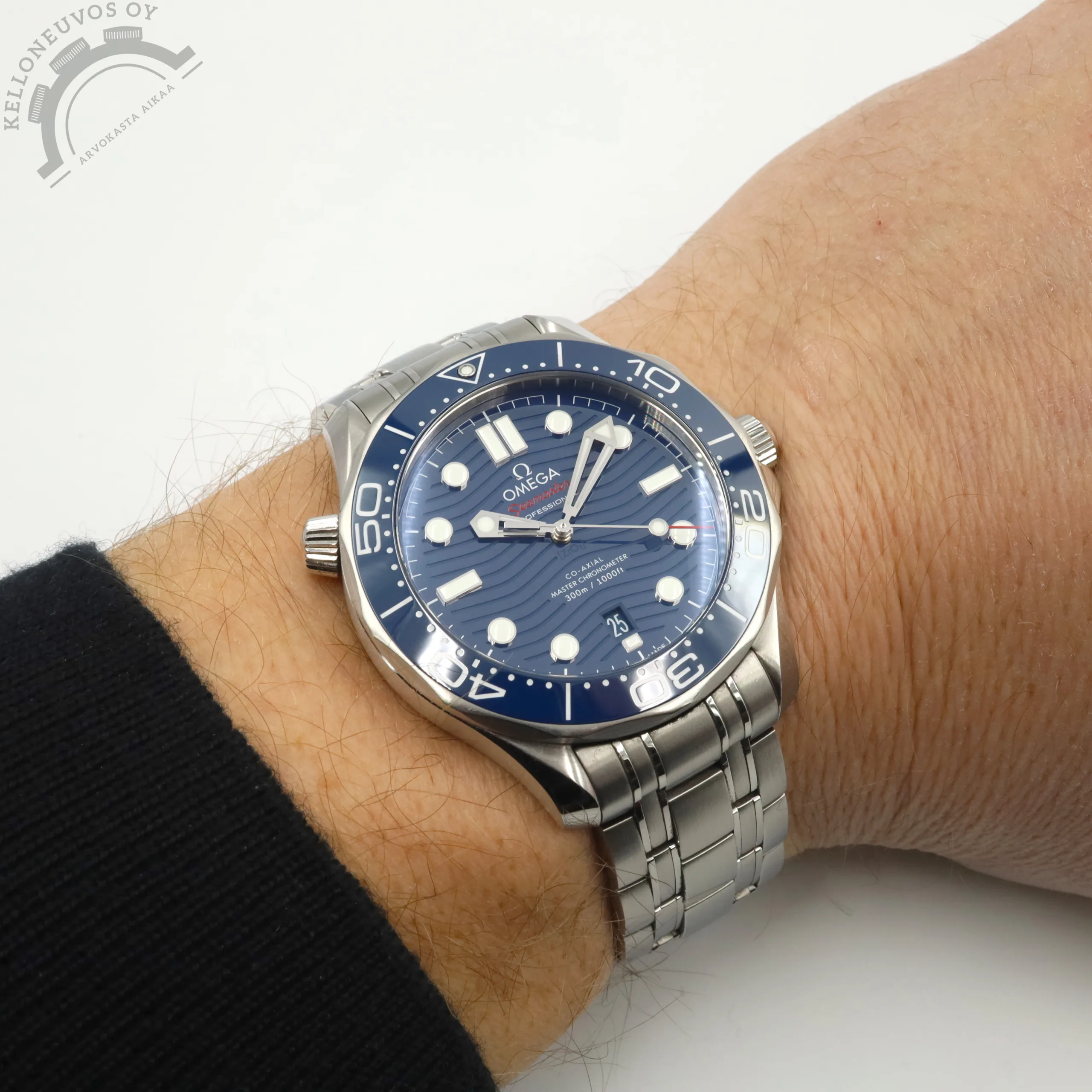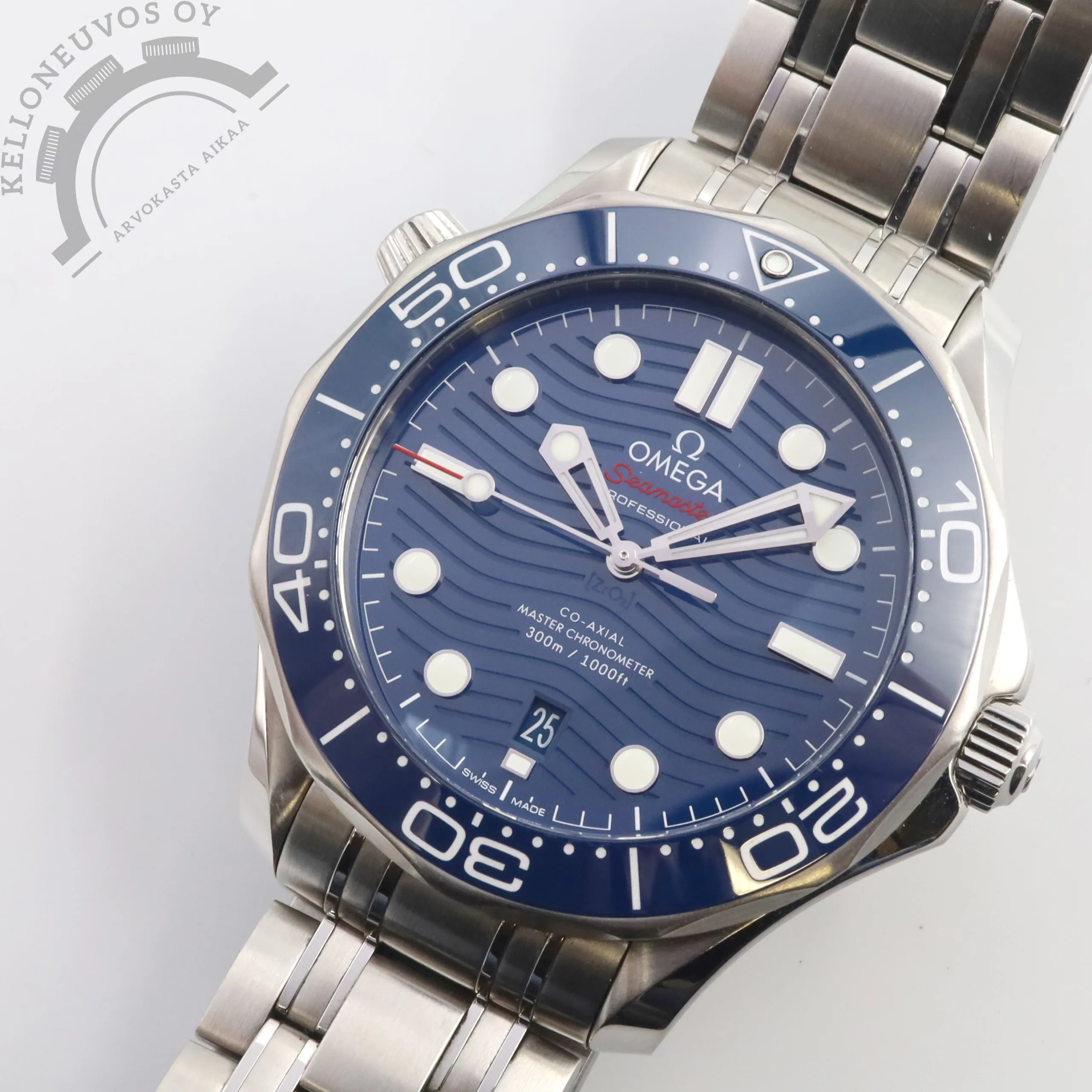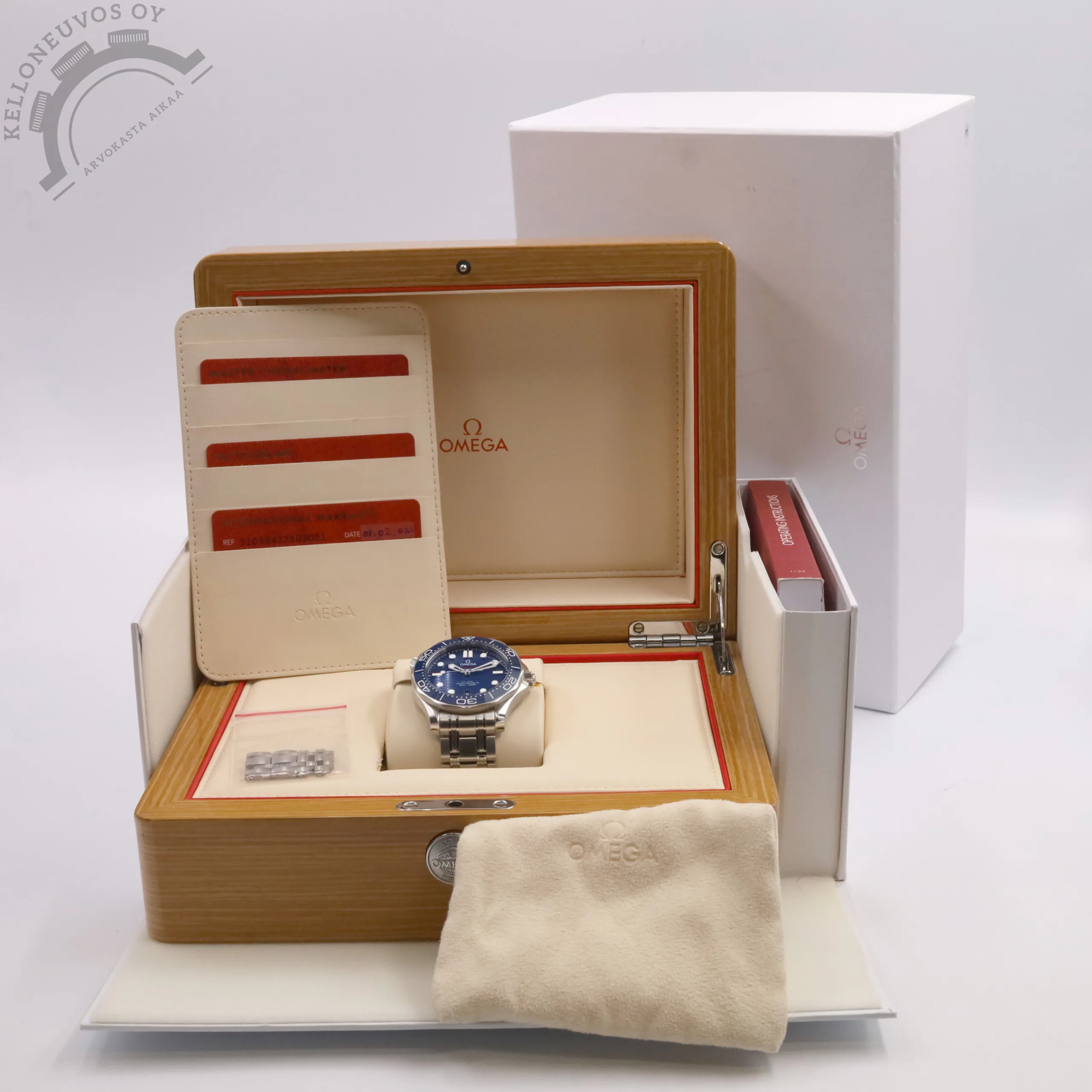 Tarjolle näyttävä sinisellä taululla sekä sinisellä keraamisella kehällä varustettu Seamaster Diver. Upealla sinisellä aaltotaululla jossa päivyri sekä loistavan lumen omaavat osoittimet ja indeksit. Teräksinen kuori yhdistettynä Omegan laadukkaaseen teräsrannekkeeseen jossa käyttömukavuutta lisäävä pikasäädettävä claspi. Safiirilasit molemmin puolin runkoa, takakannen alla tikkaa nätisti Omegan METAS- sertifioitu 8800- automaattikoneisto jossa 55h käyntivara. Kelloa seuraa molemmat laatikot, rannekkeen jatkopalat, korttitasku sekä kaikki alkuperäiset kortit. Kellon takuukortti on päivätty 2/2021. Kellon suositushinta uutena 6800e.