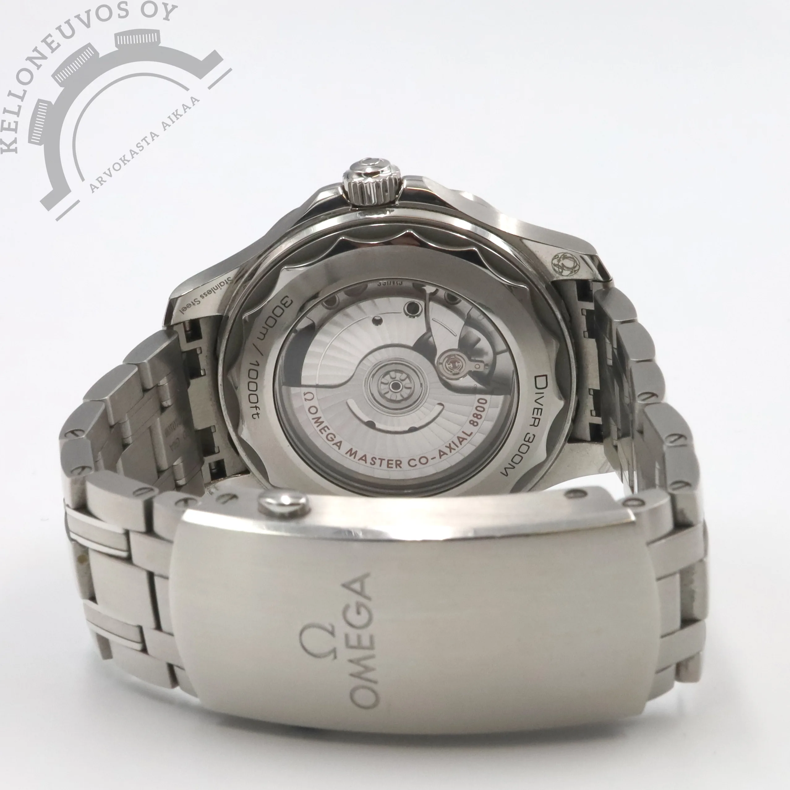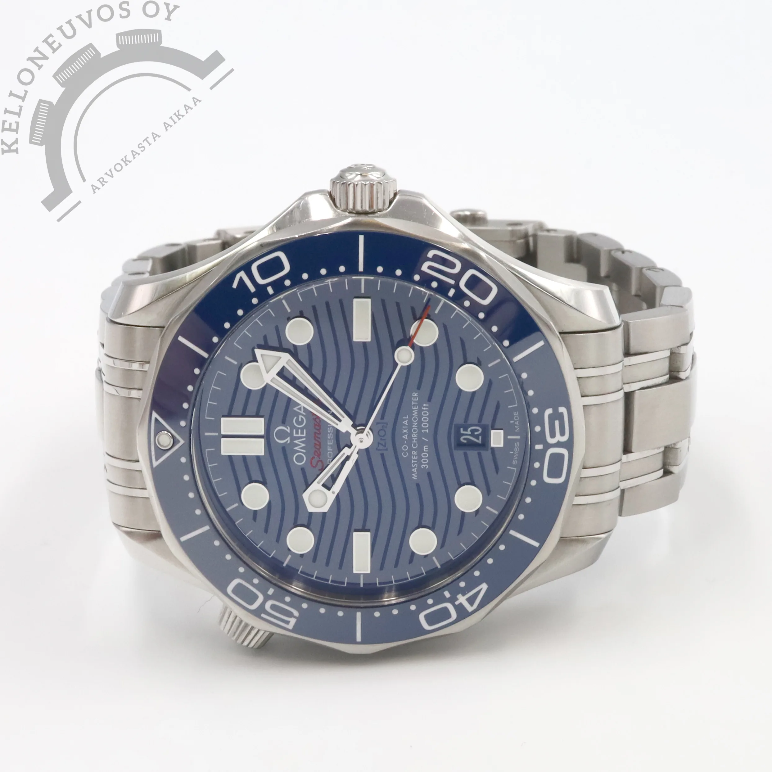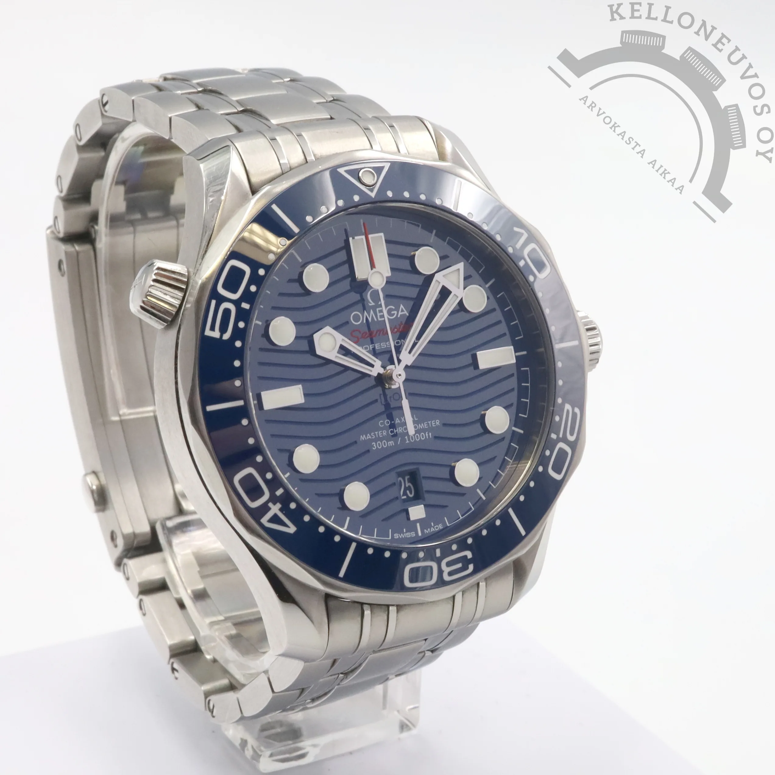 Tarjolle näyttävä sinisellä taululla sekä sinisellä keraamisella kehällä varustettu Seamaster Diver. Upealla sinisellä aaltotaululla jossa päivyri sekä loistavan lumen omaavat osoittimet ja indeksit. Teräksinen kuori yhdistettynä Omegan laadukkaaseen teräsrannekkeeseen jossa käyttömukavuutta lisäävä pikasäädettävä claspi. Safiirilasit molemmin puolin runkoa, takakannen alla tikkaa nätisti Omegan METAS- sertifioitu 8800- automaattikoneisto jossa 55h käyntivara. Kelloa seuraa molemmat laatikot, rannekkeen jatkopalat, korttitasku sekä kaikki alkuperäiset kortit. Kellon takuukortti on päivätty 2/2021. Kellon suositushinta uutena 6800e.