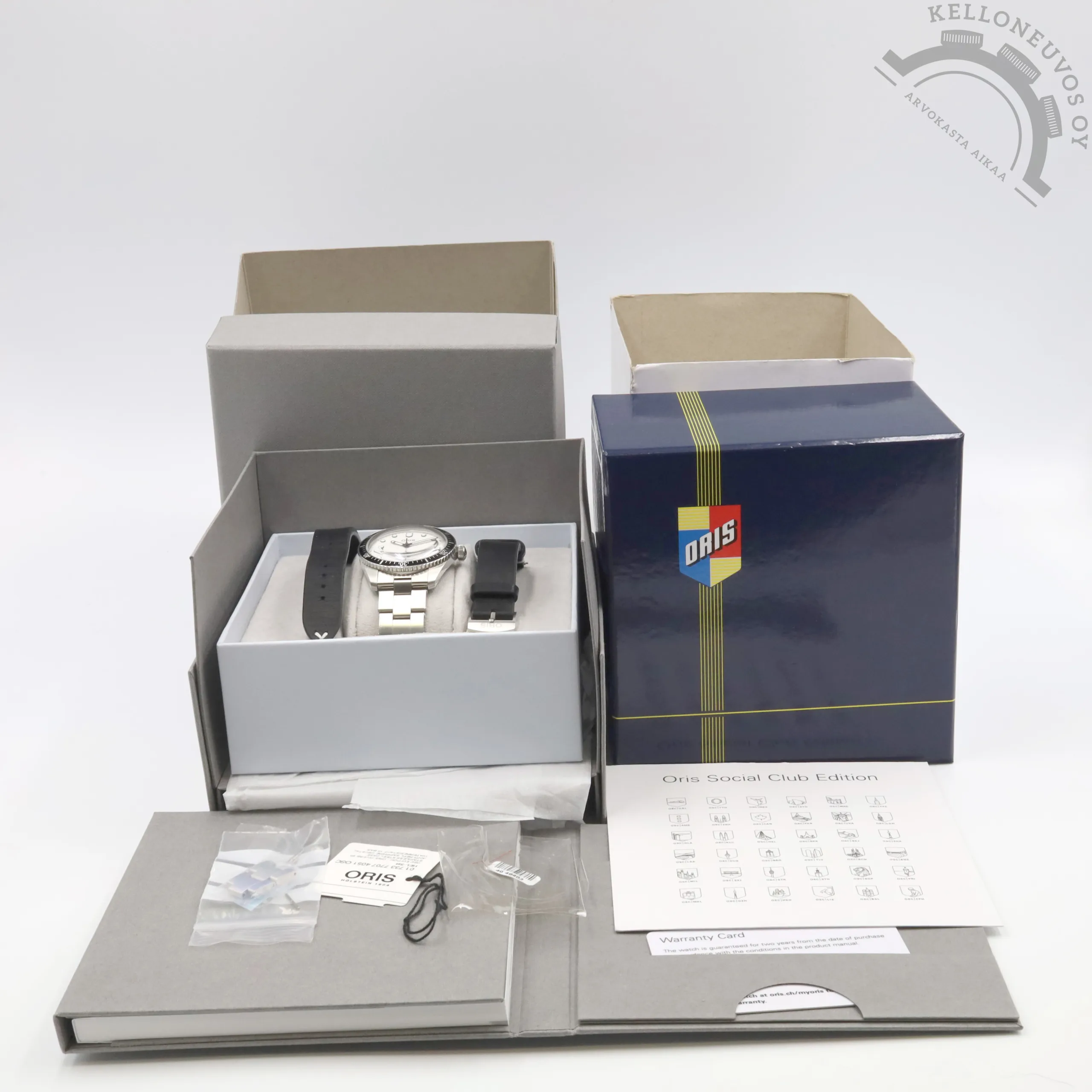Tarjolle upea Oris Social Club Helsinki. Tämän OSC-HEL mallin valmistusmäärä rajattu 30 kappaleeseen mutta ainoastaan 10 kappaletta päätynyt tilaukseen, harvinainen keräilykohde siis kyseessä. Selkeälukuisella vaalealla taululla jossa ei mitään ylimääräistä. Teräksinen ohut kuori jossa kiinni erikseen ostettu merkin oma teräsranneke. Mukaan luonnollisesti malliin kuuluva musta nahka omalla soljella. Kupera safiirilasi suojaa kellon etupuolta kun taas teräksisen takakannen alla jota koristaa Helsingin stadionin torni tikkaa nätisti Oris 733 -automaattikoneisto. Full set, kellon elektroninen takuukortti on aktivoitu 12/2022.