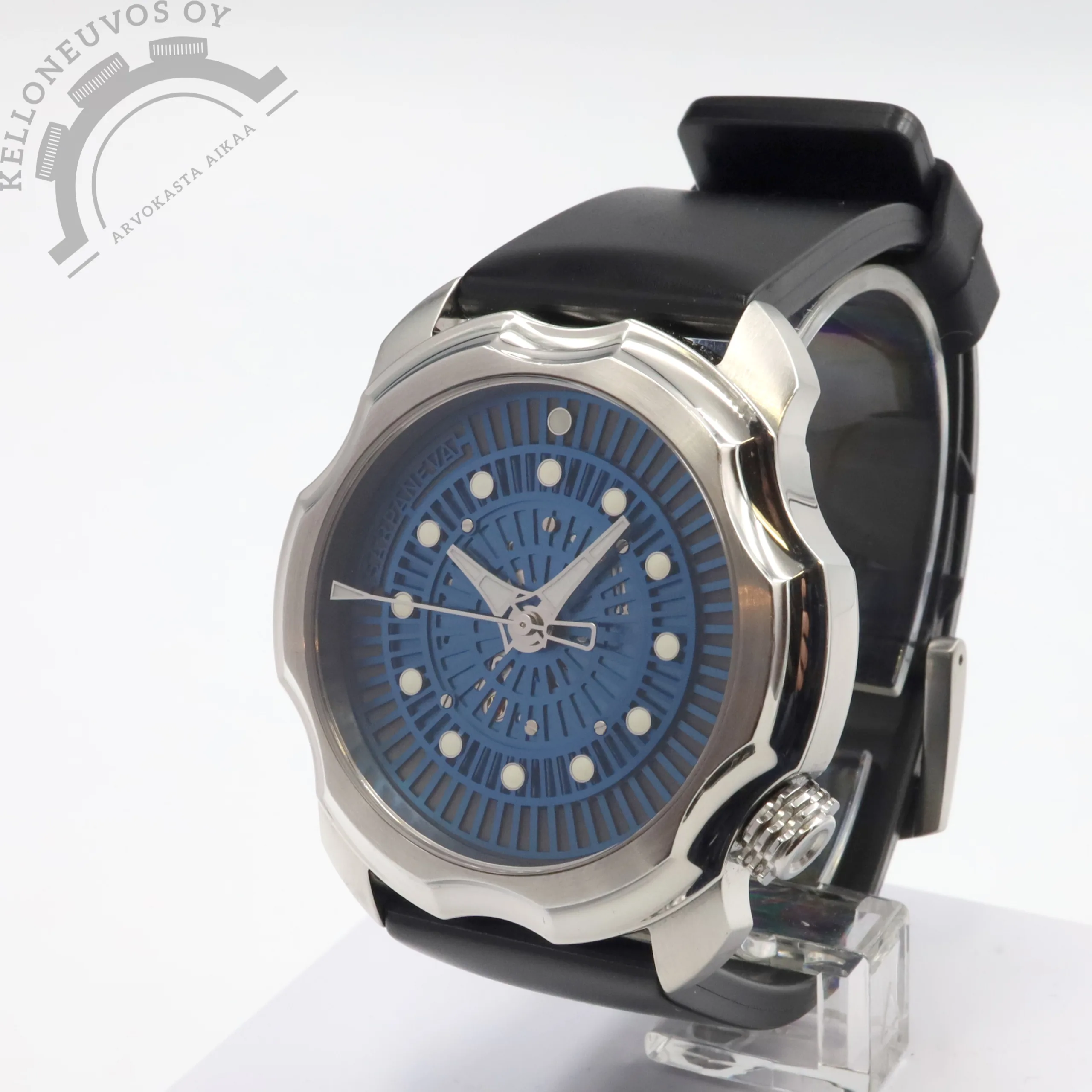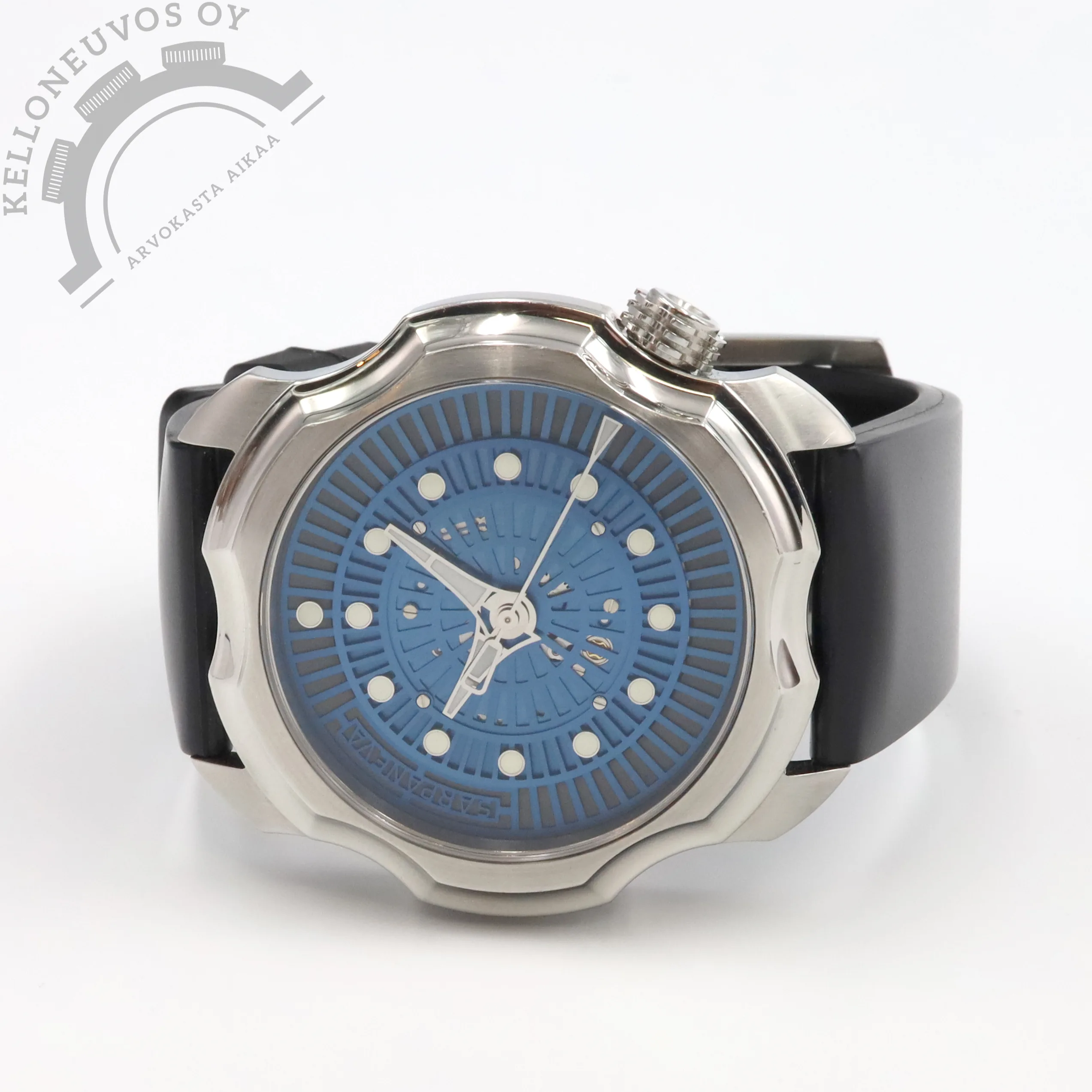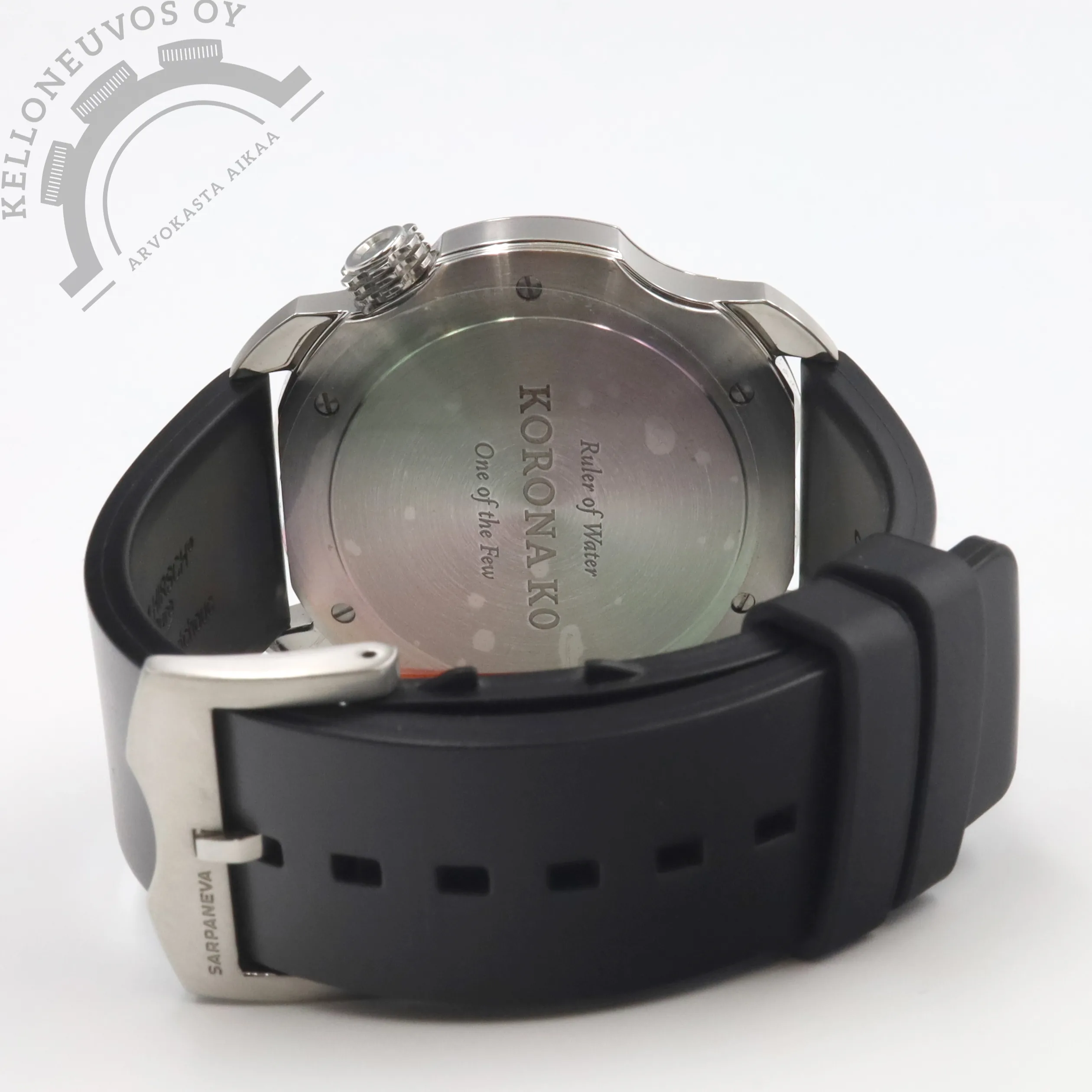 Tarjolle kotimaista, korkealle arvostettua huippu muotoilua ja osaamista. Sarpaneva Korona K0 ”Ruler of Water” tarjoaa juuri sitä. Kello jota ei ihan jokaiselta löydy, kuten kellon takakansikin sen kertoo ”One of Few”! Erittäin näyttävä sininen taulu näyttävillä osoittimilla ja indekseillä. Teräksinen kuori tunnistettavalla muotoilulla. Rannekkeina kuvissa näkyvä kumiranneke omalla soljella, musta nahkaranneke sekä sininen Grassbay-ranneke, kaikki Sarpanevan omia. Koneistona toimii Soprod A10- automaattikaliiperi. Full set, kellon alkuperäinen takuukortti on päivätty 9/2017. Lisäksi kello on täyshuollettu Sarpanevan työhuoneella 2/2023. Nappaa tästä talteen harvinaisuus joita ei liian usein vastaan tule!