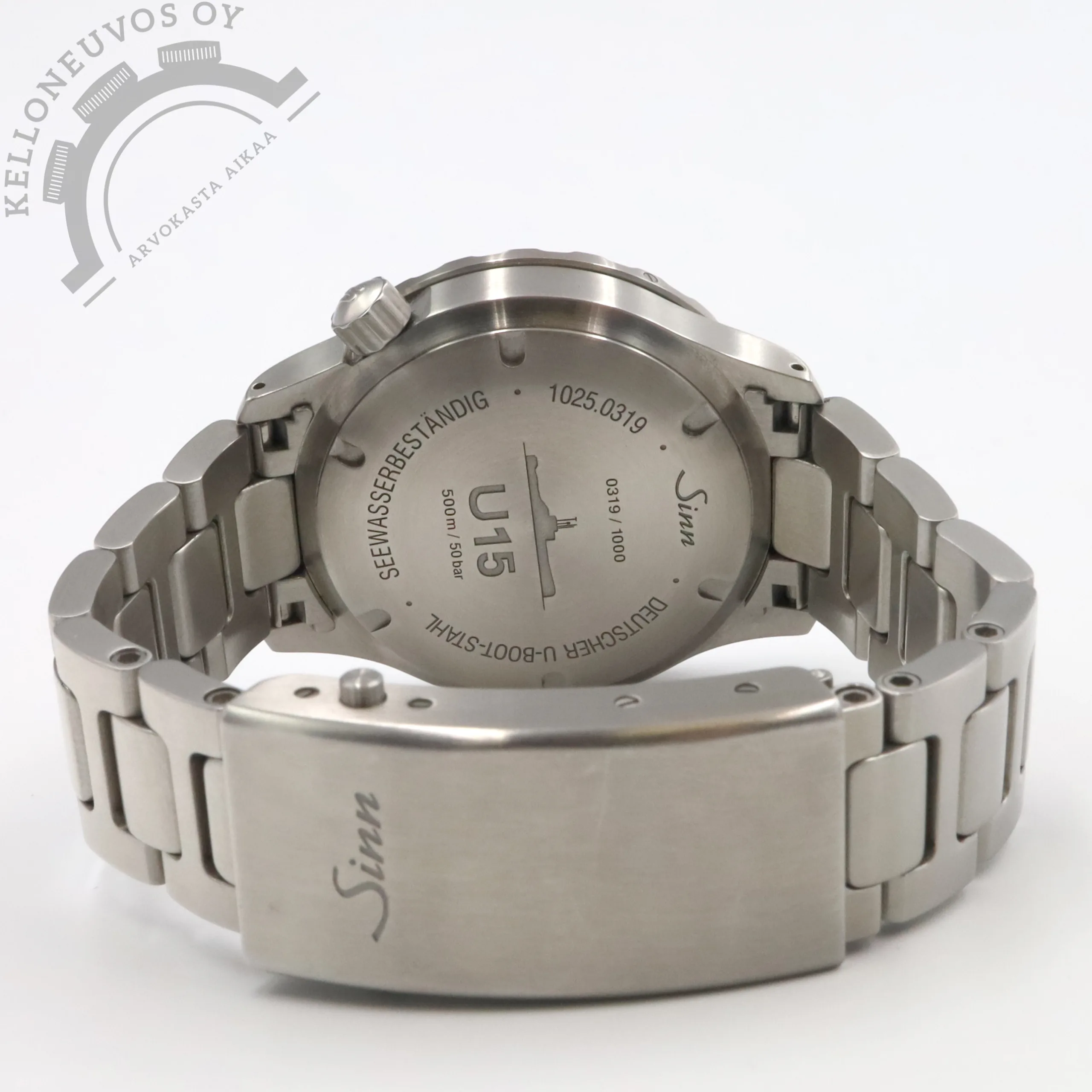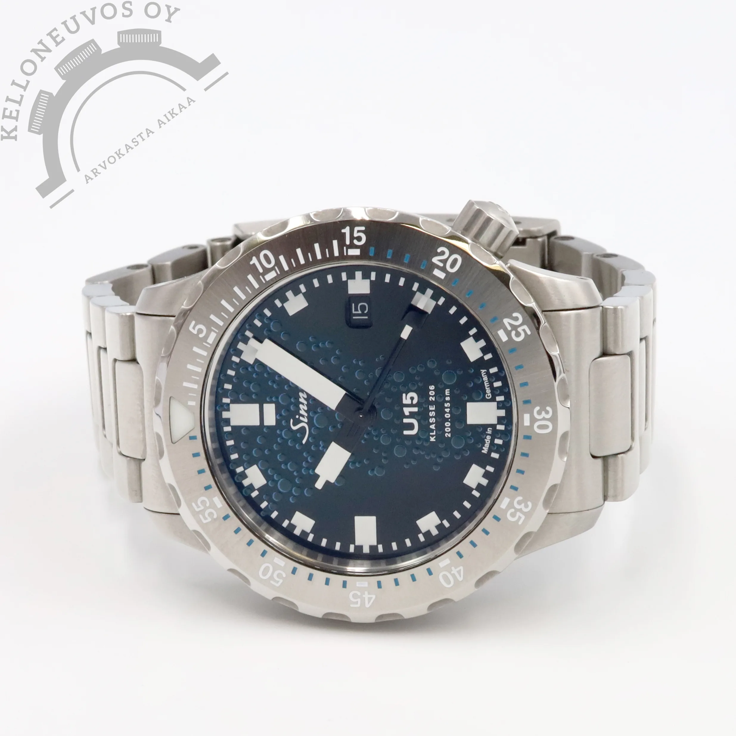 Tarjolle todella upea Sinn U15 jota valmistettu ainoastaan 1000 kappaleen rajoitettu erä. Tumman sinivihreä kellotaulu kuvastaa avomeren syvyyksiä ja näyttävyyttä lisäävät ilmakuplat tuovat sille upean kolmiuloitteisen ilmeen, lisäksi löytyy päivyri sekä loistavan lumeen omaavat osoittimet ja indeksit. Kellon kuori on valmistettu U 15 -sukellusveneen teräksestä ja sen sukeltajankehä TEGIMENT teknologialla joka tekee siitä lähes naarmuuntumattoman. Kirkas safiirilasi suojaa kellon etupuolta kun taas teräksisen takakannen alla tikkaa tarkasti SW300-1 -automaattikoneisto. Full set, kellon takuukortti on päivätty kotimaisen jälleenmyyjän toimesta 5/2025.